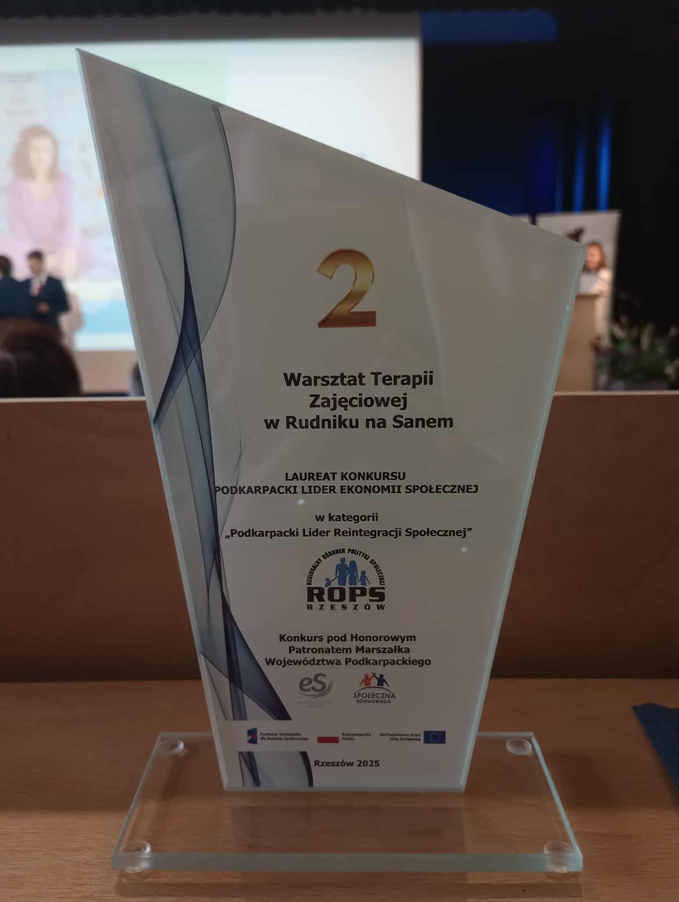Z dumą informujemy, że nasz Warsztat Terapii Zajęciowej w Rudniku nad Sanem został uhonorowany II nagrodą w konkursie "Podkarpacki Lider Reintegracji Społecznej".