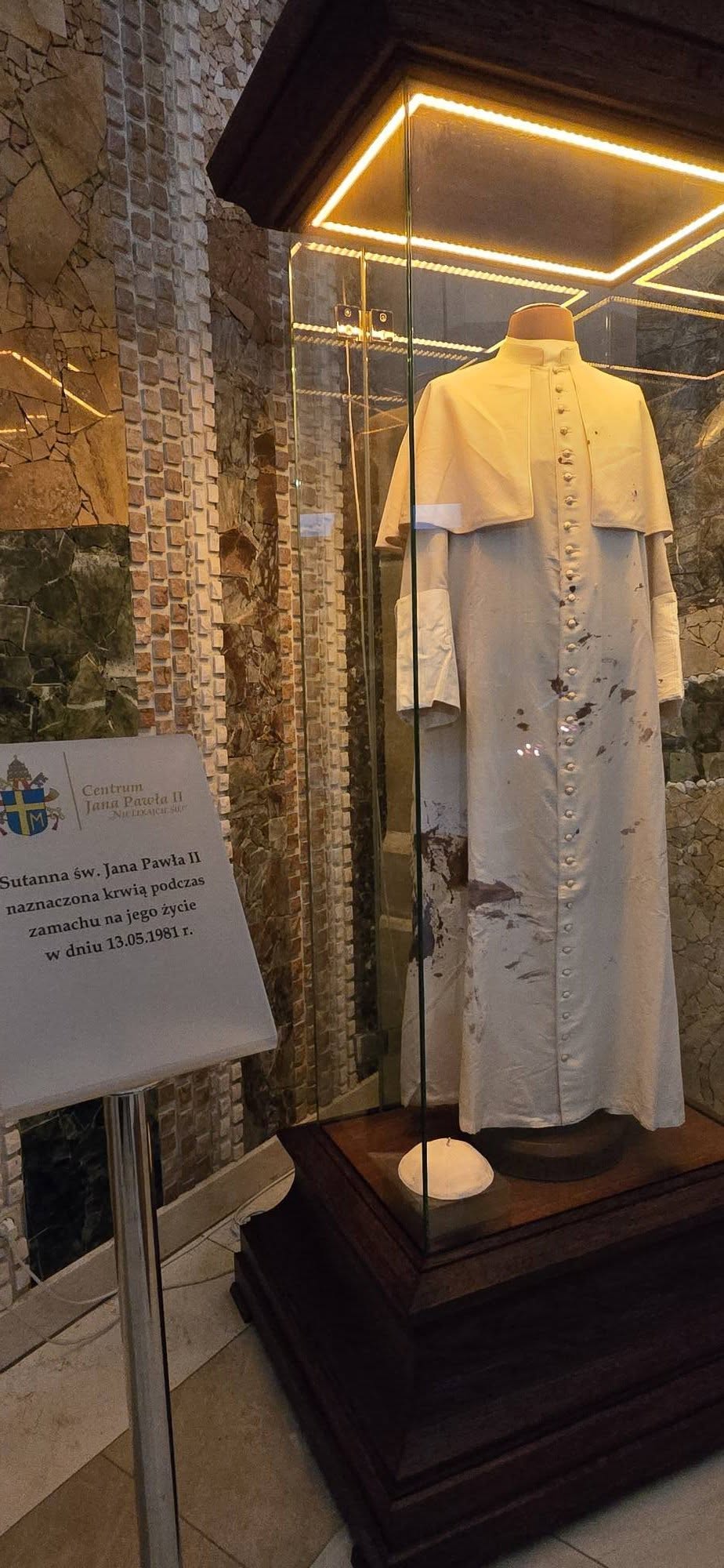 Kolejnym etapem duchowej wędrówki było Sanktuarium św. Jana Pawła II. Tam zwiedziliśmy Muzeum św. Jana Pawła II, które w niezwykle przejmujący sposób ukazuje życie i pontyfikat Papieża Polaka. Ekspozycja przybliżyła pielgrzymom jego nauczanie o miłosierdziu, pokoju i godności człowieka. Szczególne wrażenie wywarły autentyczne pamiątki z życia Świętego, w tym fragment sutanny z dnia zamachu oraz liczne fotografie dokumentujące jego posługę na całym świecie.