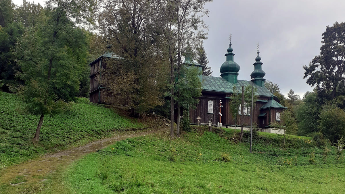 Trzecia grupa (najmniej sprawna) udała się natomiast do Cerkwi Zaśnięcia Przenajświętszej Bogurodzicy w Szczawnem. Cerkiew znajduje się na niewielkim wzniesieniu w pobliżu drogi do Komańczy, a dopełnieniem jej uroku jest znajdujący się obok stary cmentarz. Została zbudowana w 1889 przez cieślę Hojsana z Płonnej. Niedaleko cerkwi znajduje się drewniana dzwonnica. Nabożeństwa w cerkwi celebrowane są co drugą niedzielę przez duchownych z Morochowa. Główna uroczystość przypada 28 sierpnia – w święto Zaśnięcia Bogurodzicy.