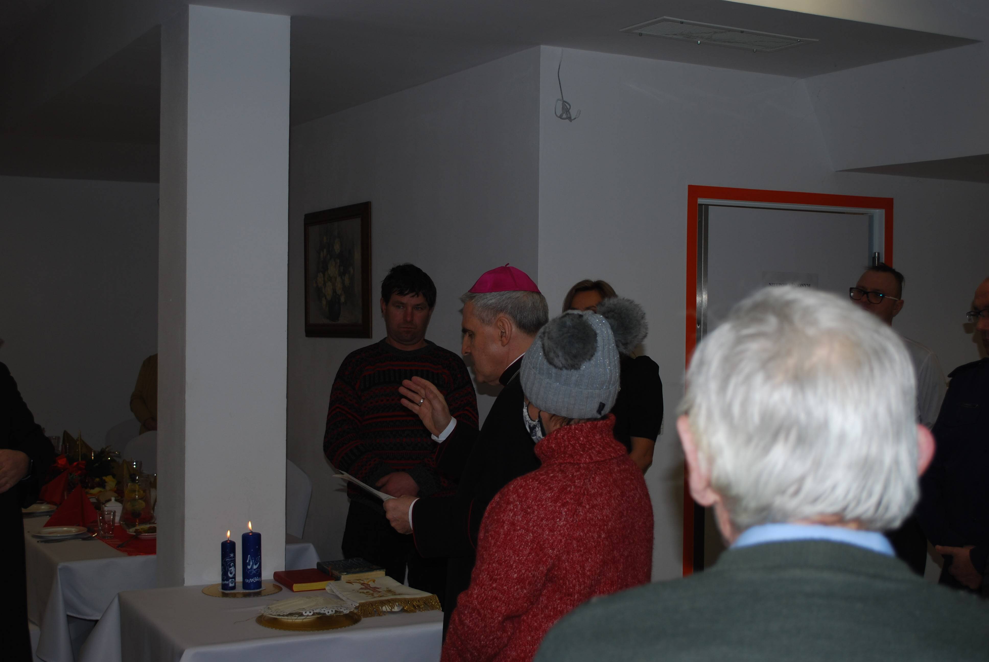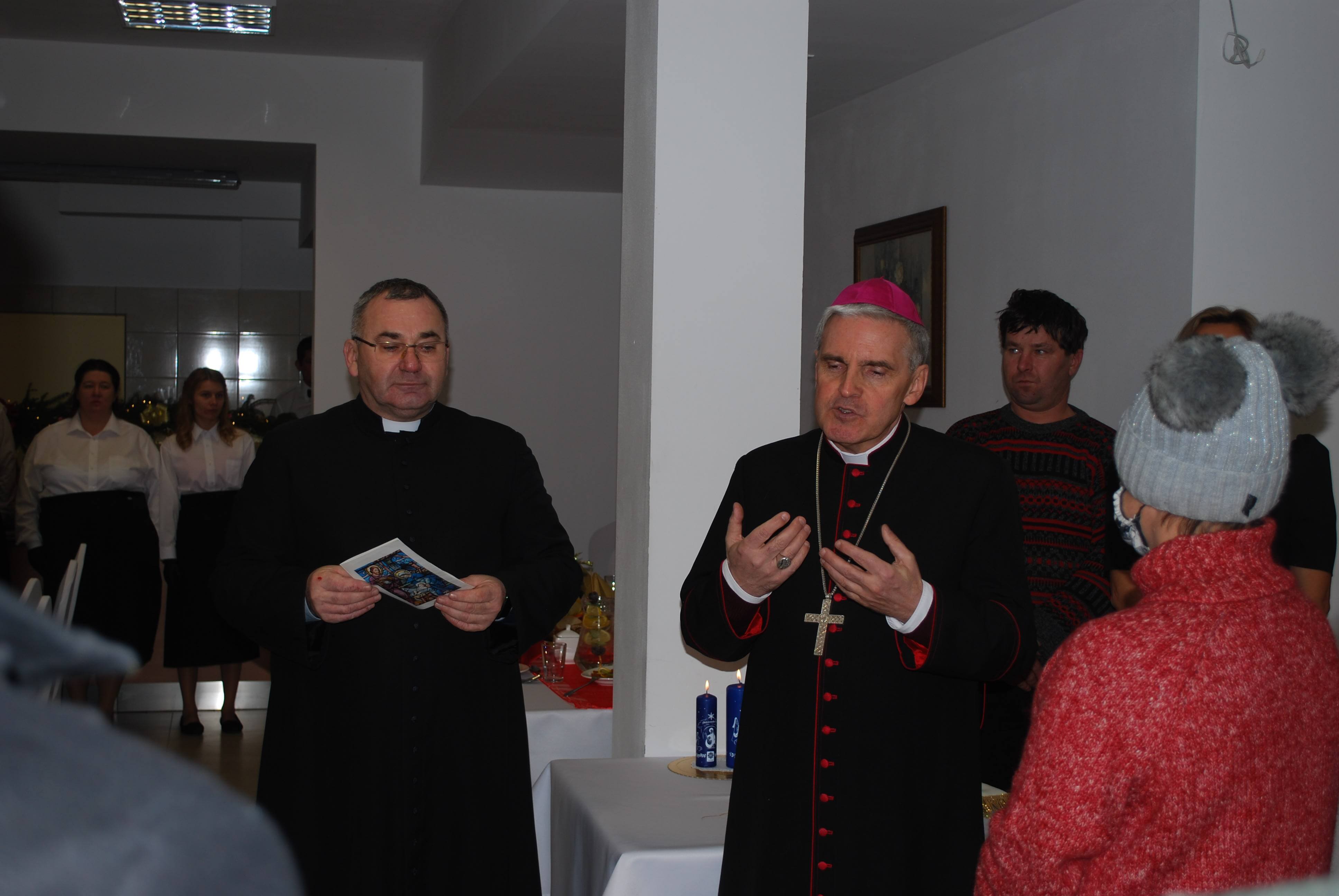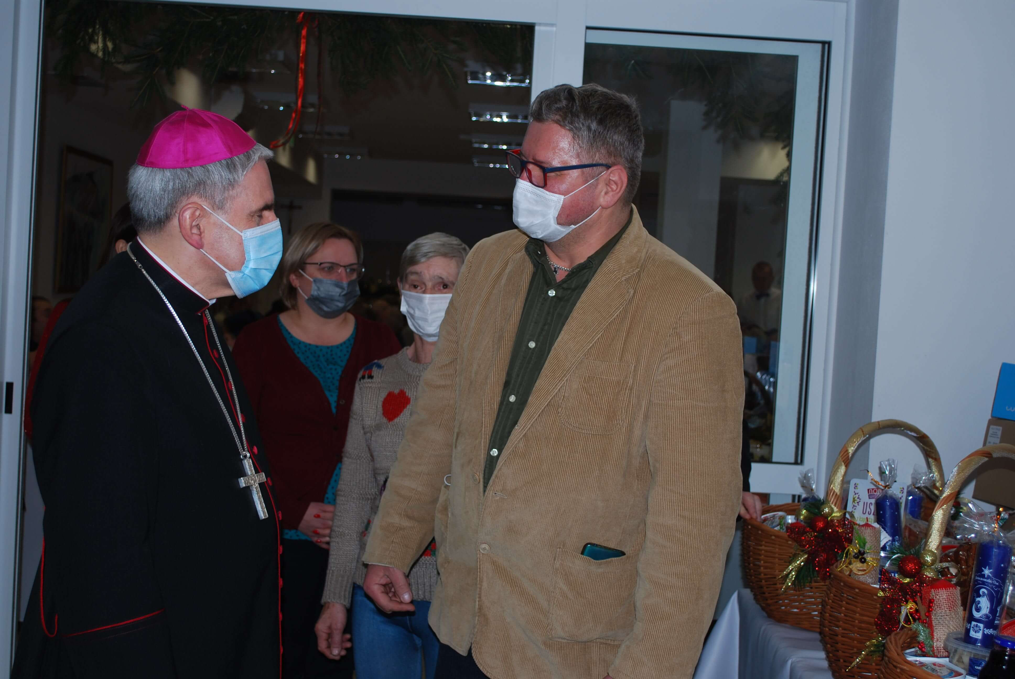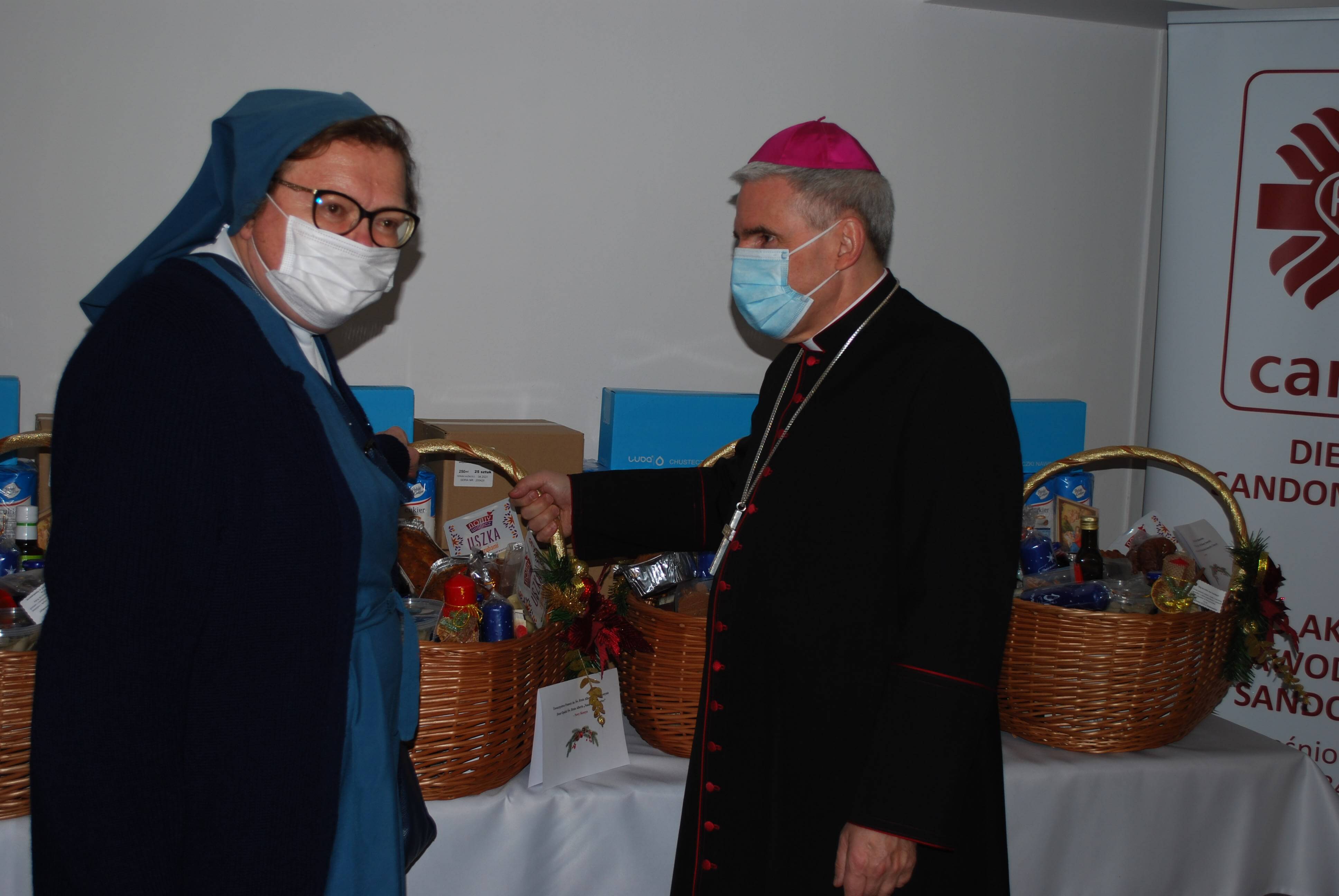 W trakcie tego wyjątkowego spotkania Ks. Bp Nitkiewicz przybyłym na tę uroczystość przedstawicielom siedmiu placówek przynależnych do Caritas Diecezji Sandomierskiej (tj. Zgromadzenie Sióstr Miłosierdzia Św. Wincentego a Paulo – SM (Siostry Szarytki) w Lipowej, Fundacja Domy Wspólnoty Chleb Życia - Schronisko Przemienia Pańskiego w Jankowicach, Schronisko dla Bezdomnych Mężczyzn w Sandomierzu, Towarzystwo Pomocy im. Św. Brata Alberta Koło „Nasze Gospodarstwo” w Nowym Skoszynie, Koło Stalowowolskie Towarzystwa Pomocy im. św. Brata Alberta w Stalowej Woli, Schronisko dla Bezdomnych Kobiet w Rudniku nad Sanem oraz Domu im. Błogosławionej Matki Teresy z Kalkuty przy parafii rzymskokatolickiej pw. Matki Bożej Nieustającej Pomocy w Tarnobrzegu) przekazał kosze z gotowymi produktami spożywczymi do przygotowania na wieczerzę wigilijną i święta, (w których znajdowały się: barszcz czerwony, uszka z kapustą i grzybami, susz z owoców, śledzie, konserwy rybne, ciasta – keks i pierniczki, olej lniany, wędliny, konserwy mięsne, cukier, makaron. Dodatkowo w/w placówki otrzymały środki czystości, żele i chusteczki odkażające).