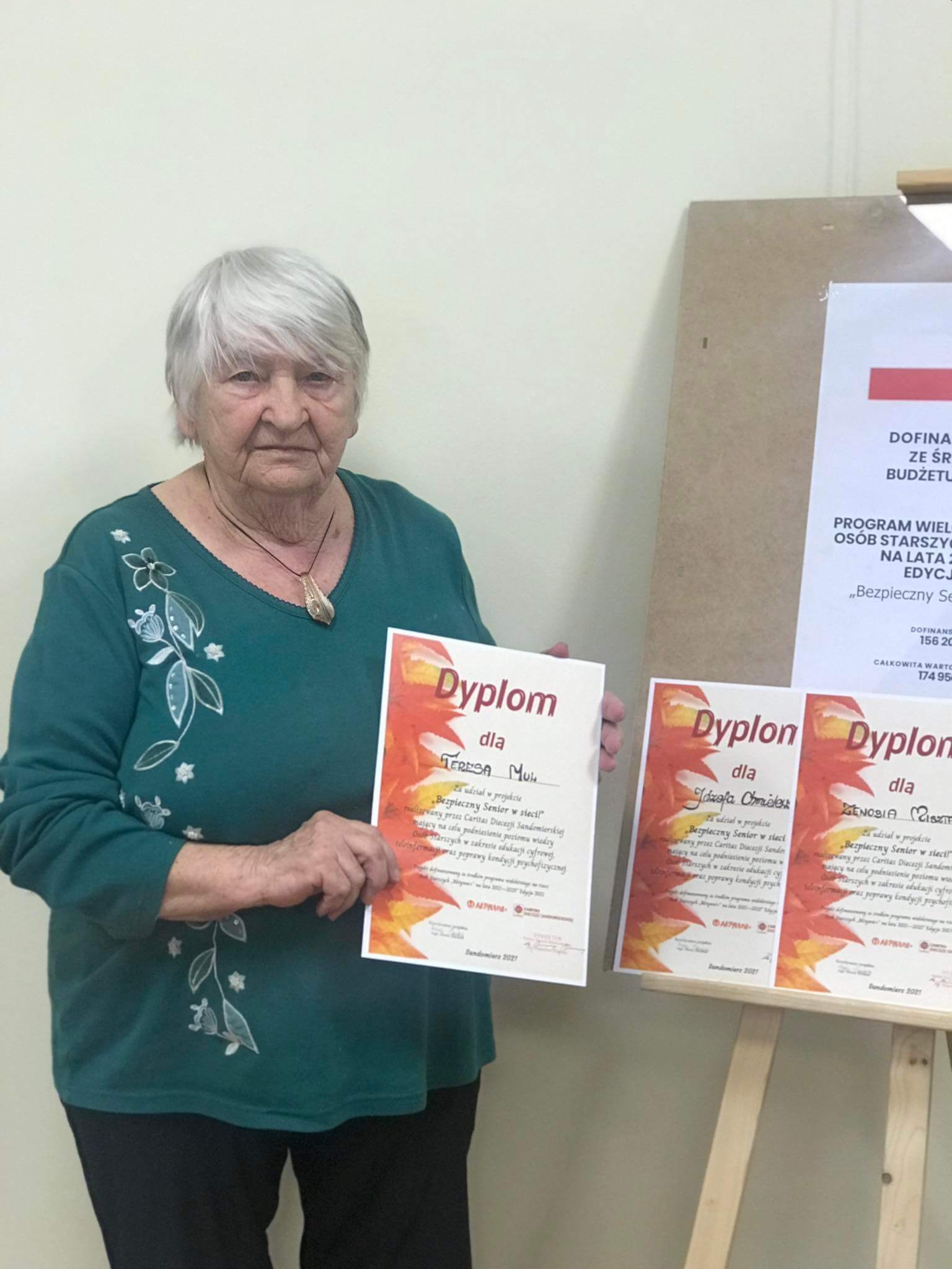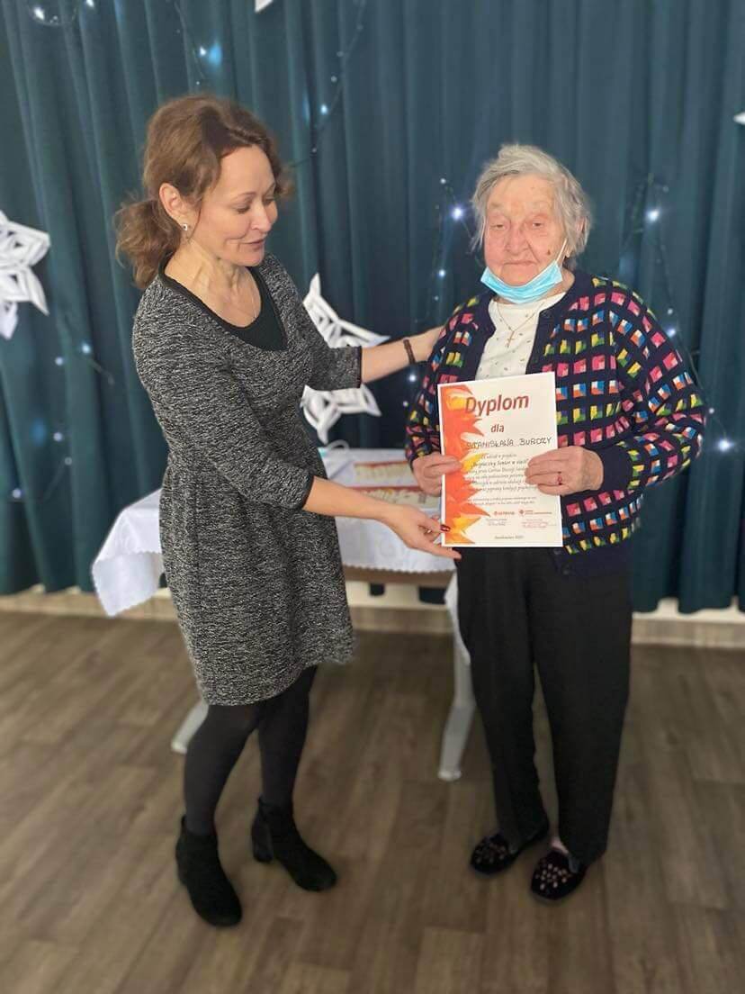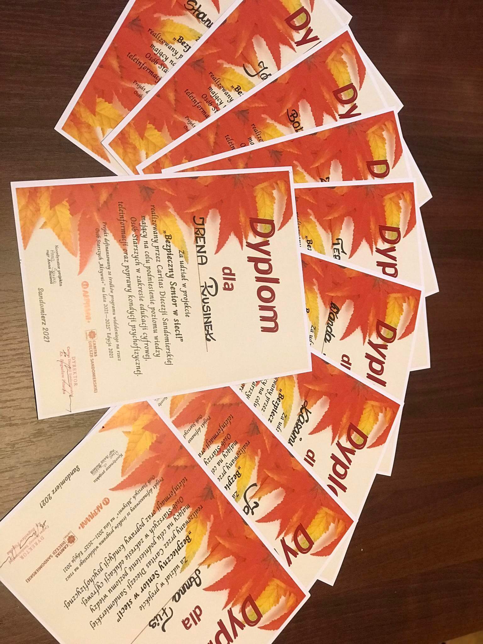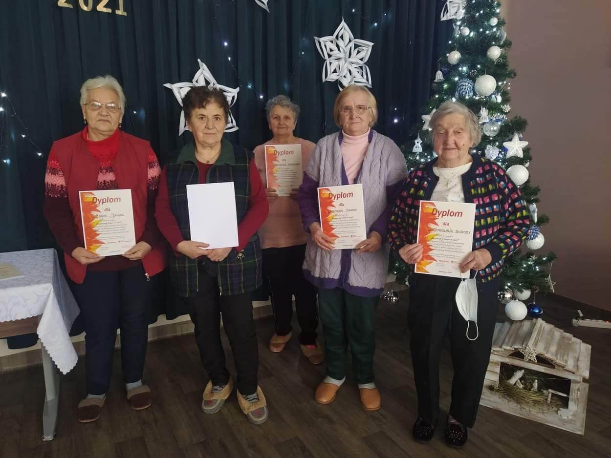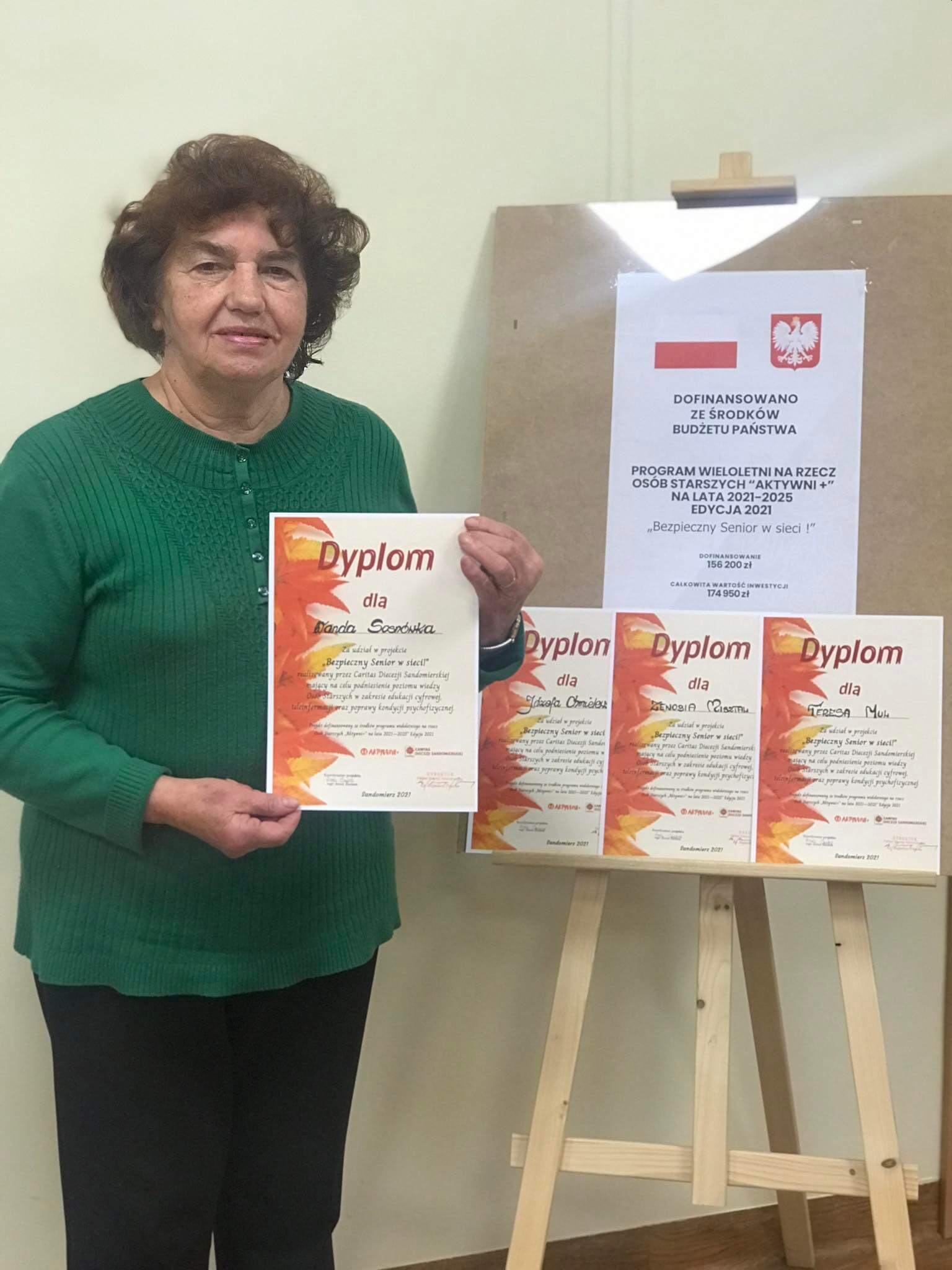 Na zakończenie realizowanego przedsięwzięcia wszystkim jego uczestnikom uroczyście złożono życzenia oraz wręczono pamiątkowe dyplomy potwierdzające udział w projekcie pn. „Bezpieczny Senior w Sieci!”.