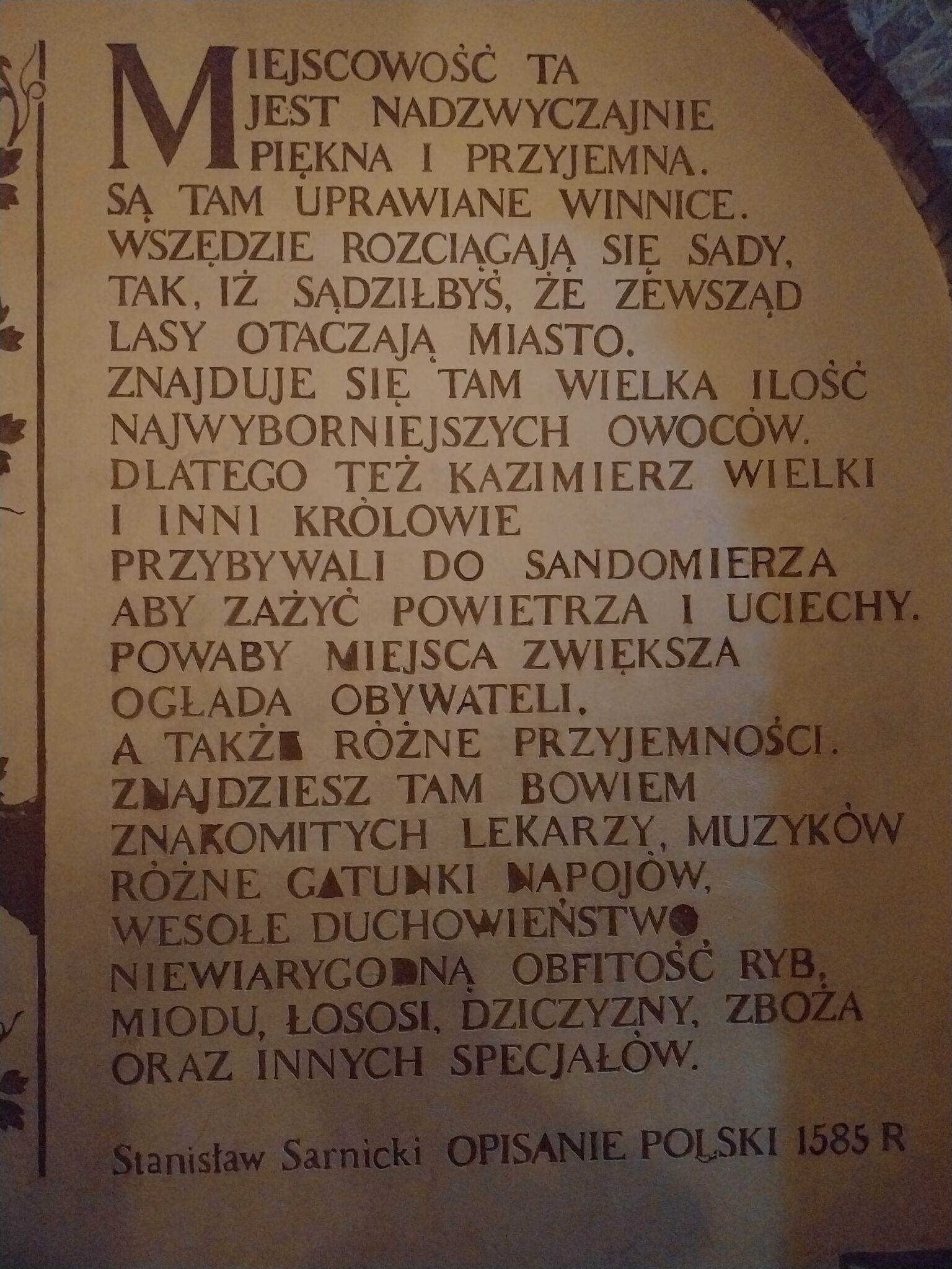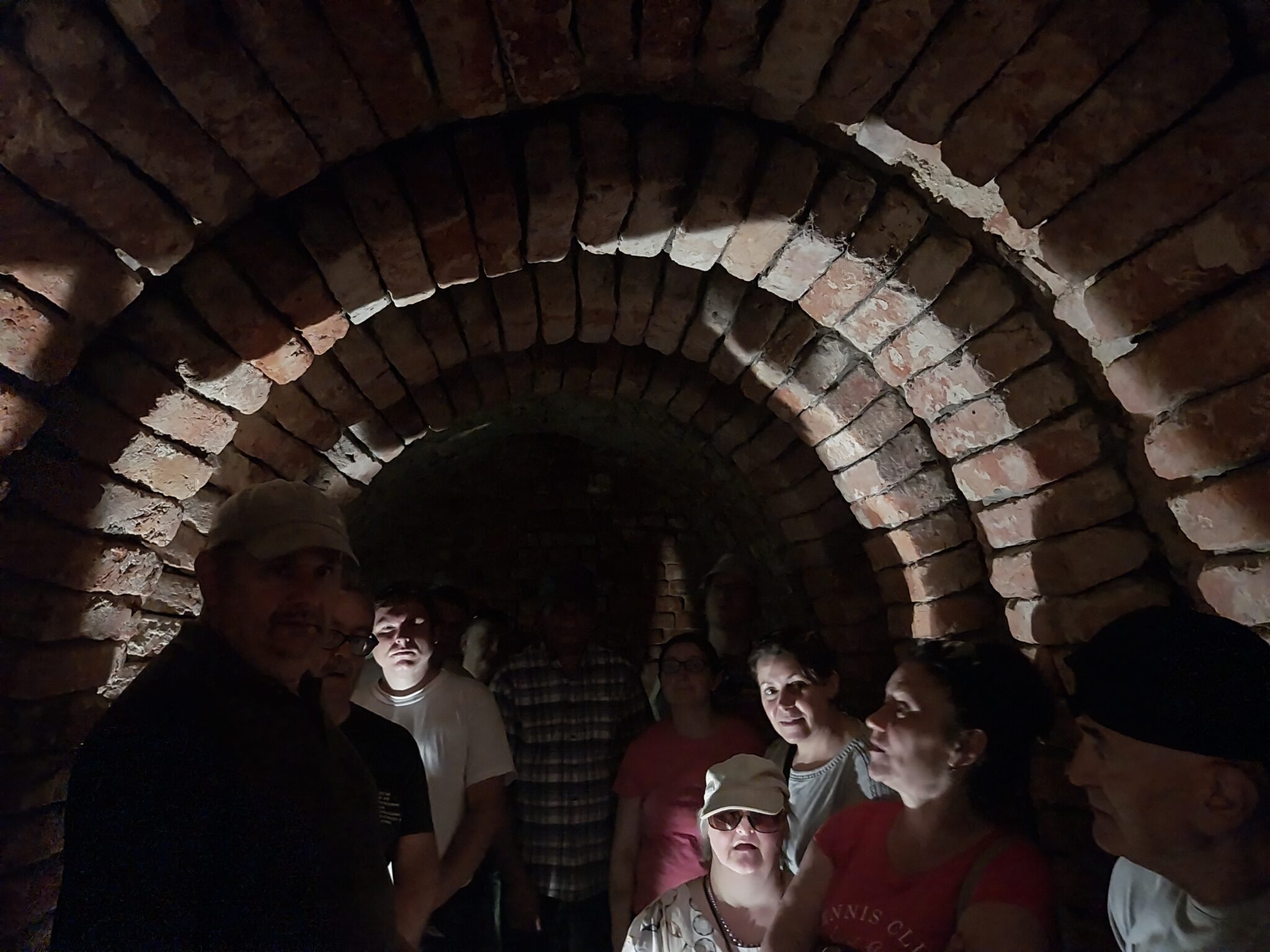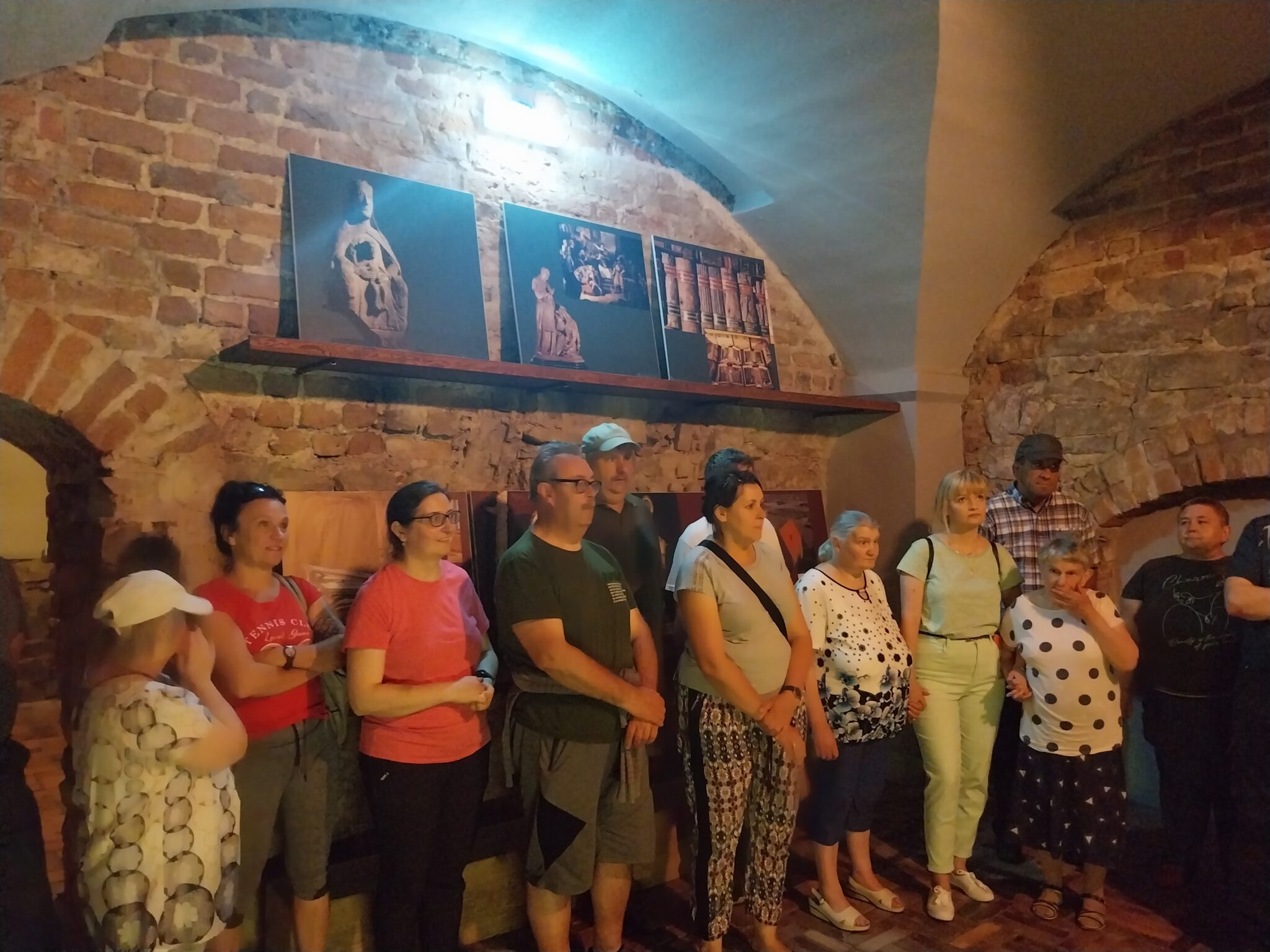 Następnie udaliśmy się do zwiedzania Podziemnej Trasy Turystycznej. Jest to udostępniona do zwiedzania część kilkukondygnacyjnych komór i chodników znajdujących się pod Starym Miastem. Ich powstaniu sprzyjała zalegająca na tym terenie gruba warstwa lessu. Drążone korytarze pełniły w minionych wiekach rolę składów kupieckich, w których przechowywano głównie wino, sól i śledzie. Służyły także jako schronienie w niebezpiecznych sytuacjach. Zapotrzebowanie na podziemne magazyny było ogromne, co spowodowało, że osiągały one nawet 15 metrów głębokości. Po kilku wiekach, kiedy pozycja Sandomierza nie była już tak strategiczna, lochy odeszły w zapomnienie. Nieużywane i niezabezpieczone stały się przyczyną katastrof budowlanych. Na ratunek Starego Miasta pośpieszyli naukowcy z Akadami Górniczo – Hutniczej w Krakowie. Po zrealizowaniu specjalnego programu odzyskano obszar prawdziwego, kilkukondygnacyjnego labiryntu piwnic oraz korytarzy. Część wyrobisk musiała zostać zlikwidowana ze względów konstrukcyjnych. Z pozostałych odcinków utworzono Podziemną Trasę Turystyczną. Jej długość wynosi obecnie 470 m. Najgłębsze wyrobiska znajdują się na głębokości 12 m. Każda z piwniczek/komór ma swoją nazwę, która stanowi nawiązanie do historii Sandomierza. Drążone przez wieki liczne korytarze oraz komory związane są z wieloma sandomierskimi tajemnicami i legendami.