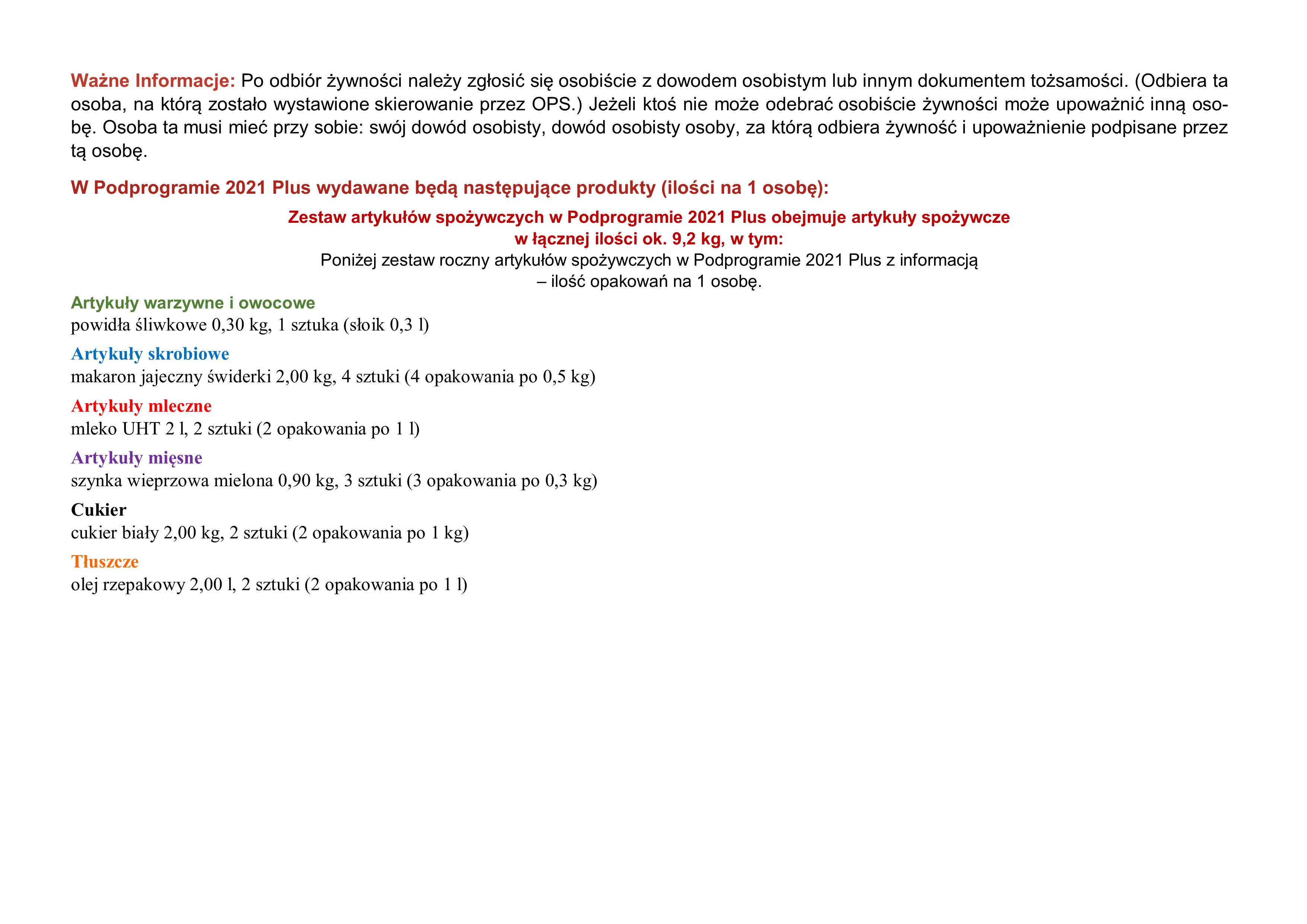 W Podprogramie 2021 Plus wydawane będą następujące produkty (ilości na 1 osobę):