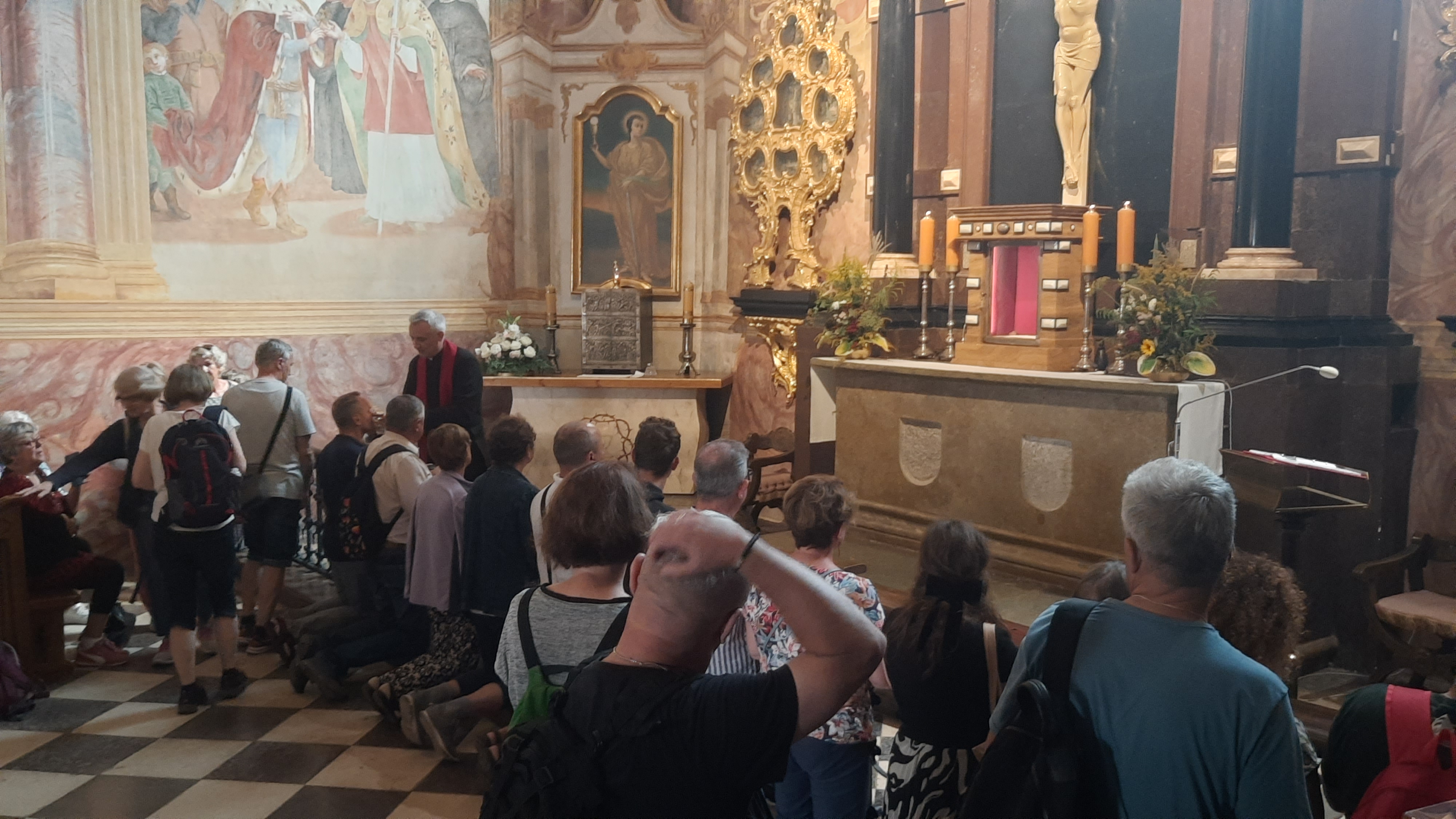 Relikwii Krzyża Świętego na Święty Krzyż. Pierwszym punktem było zwiedzanie wraz z Panią przewodnik furty klasztornej, kościoła i bazyliki Trójcy Świętej,