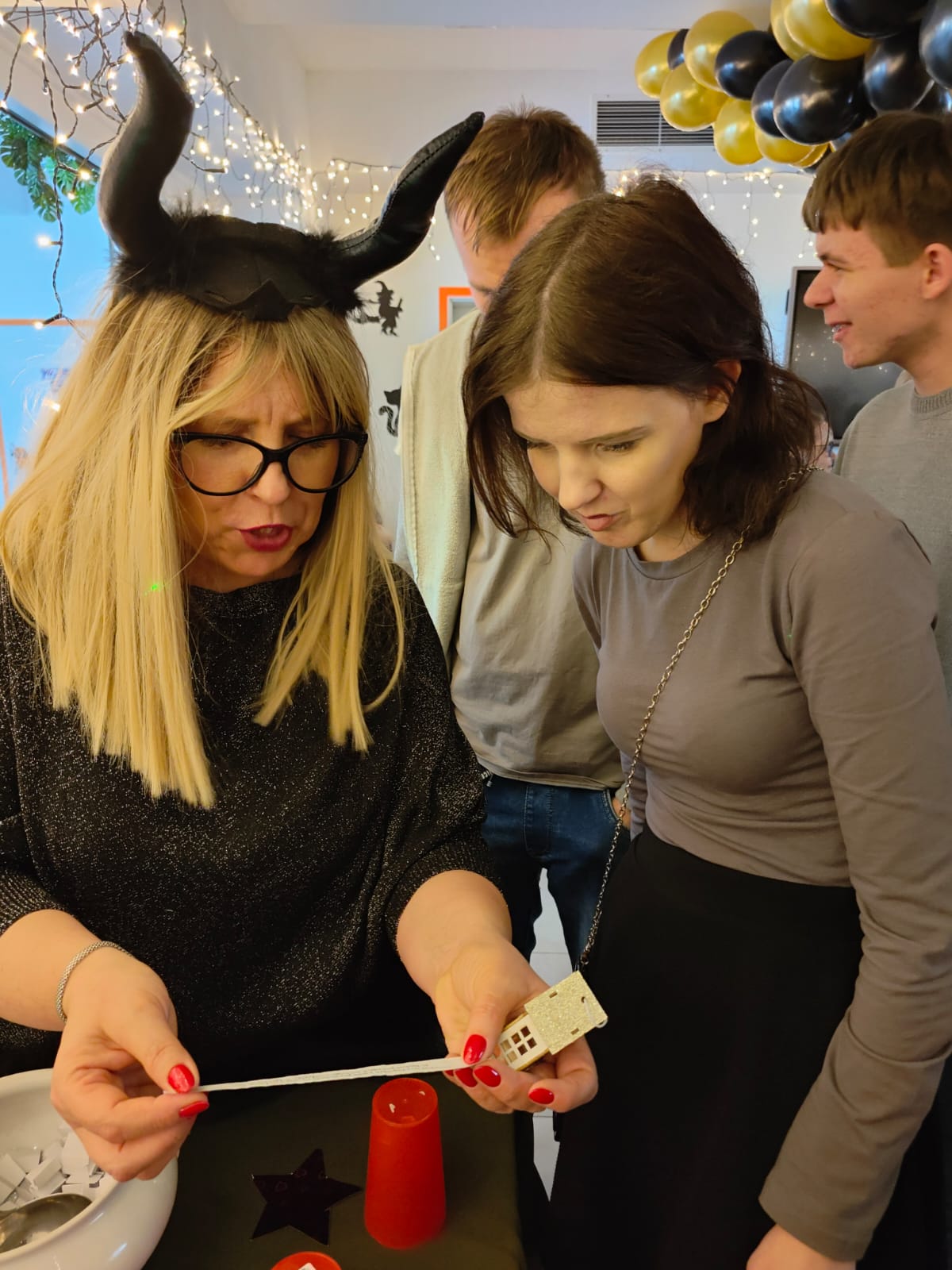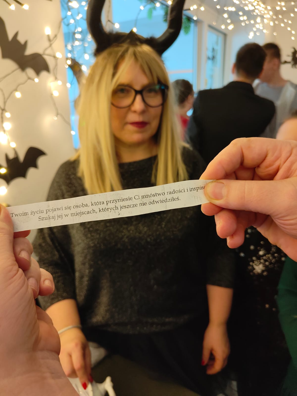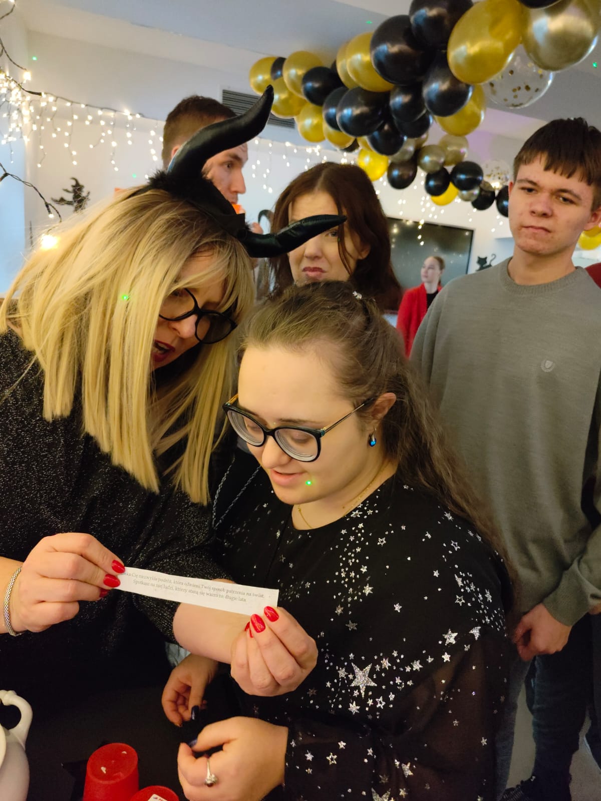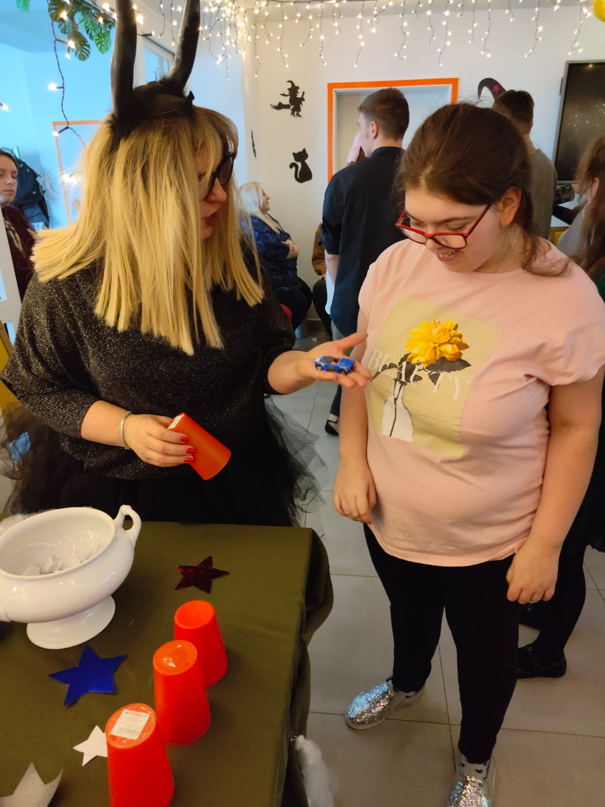 Były też przepowiednie z losowanych karteczek oraz magiczne kubeczki, pod którymi ukryte były symboliczne przedmioty. Uczestnik losując wróżbę czy kubek wybierał swoją przyszłość. Nad całością czuwali wolontariusze, którzy pomagali w prawidłowym i sprawnym przebiegu spotkania, a oprawę muzyczną zapewniła Pani Marta.