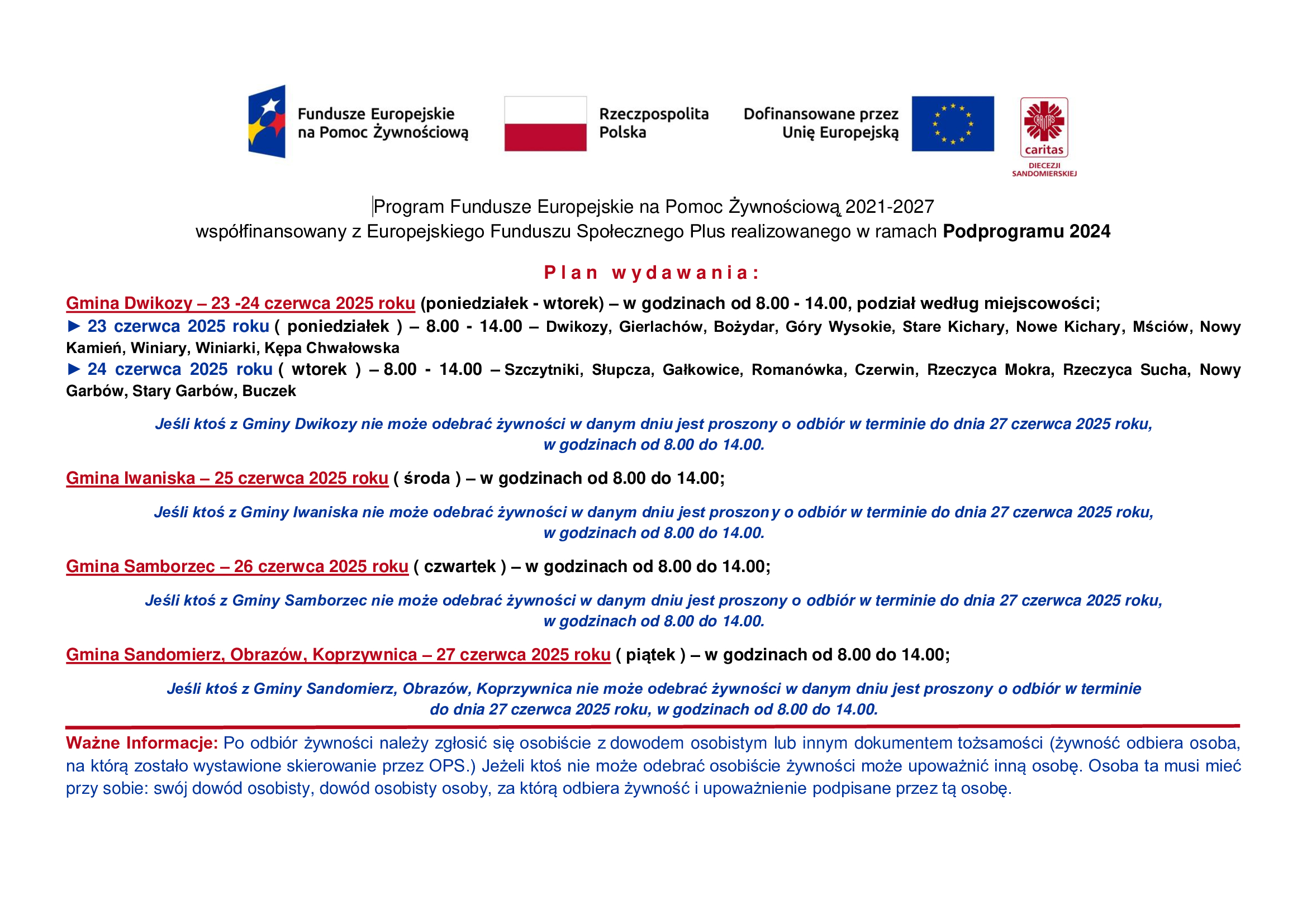 Caritas Diecezji Sandomierskiej przy współpracy z Ośrodkami Pomocy Społecznej: