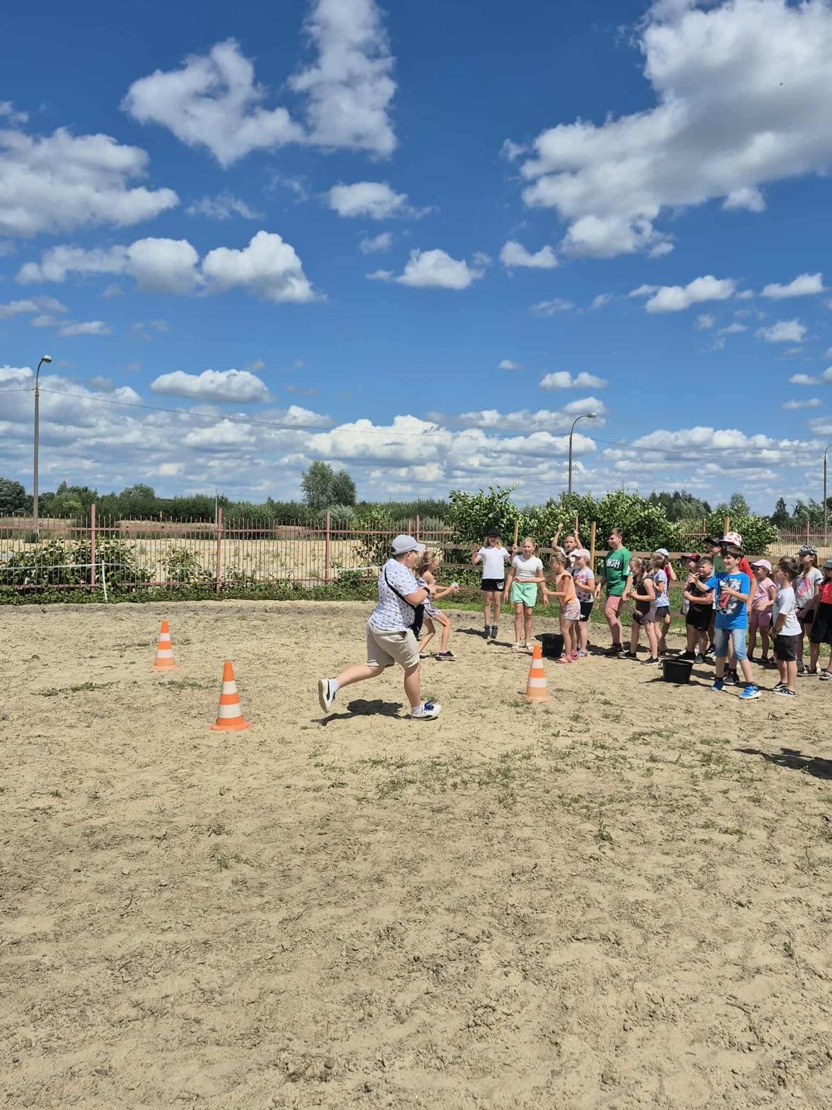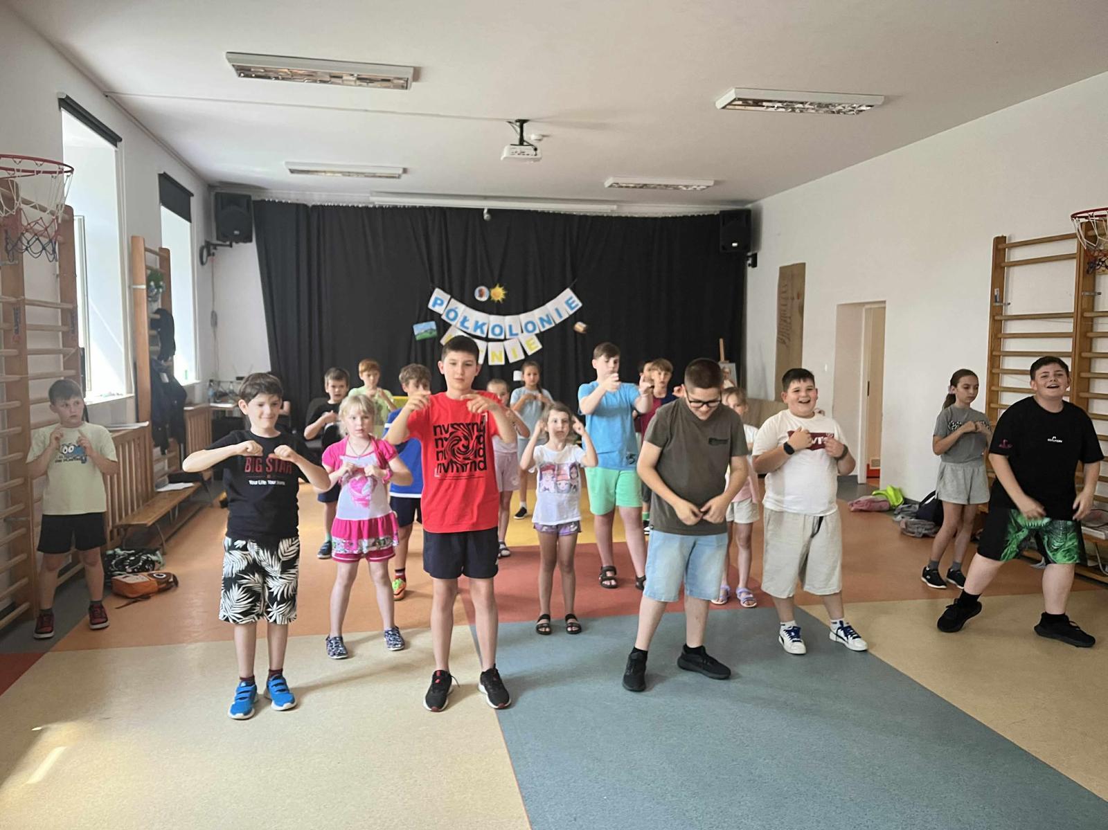 Czas półkolonii wypełniały również różnorodne gry i zabawy ruchowe, zarówno w sali gimnastycznej, jak i na świeżym powietrzu. Wszystkie działania prowadzone były z myślą o bezpieczeństwie, radości i aktywnym spędzaniu czasu przez dzieci.