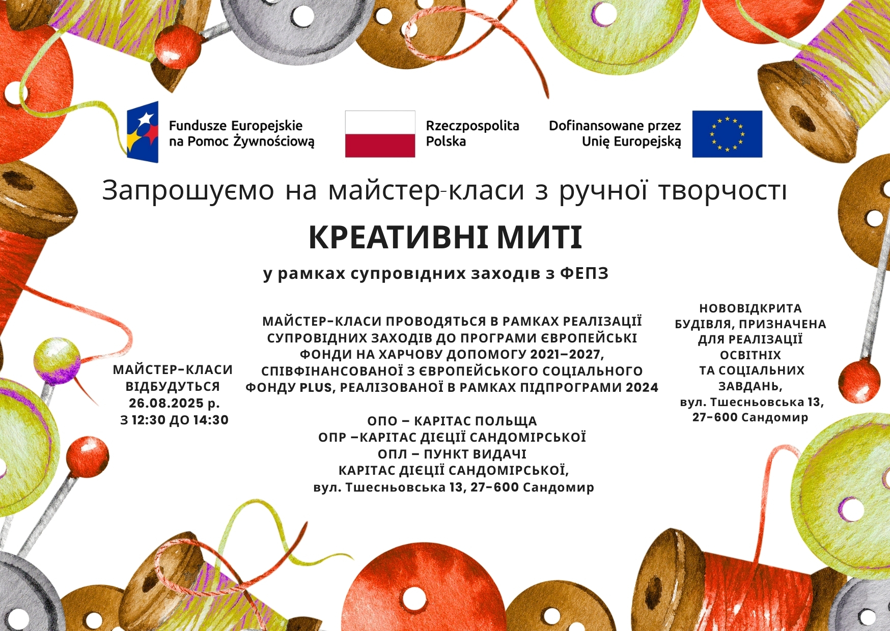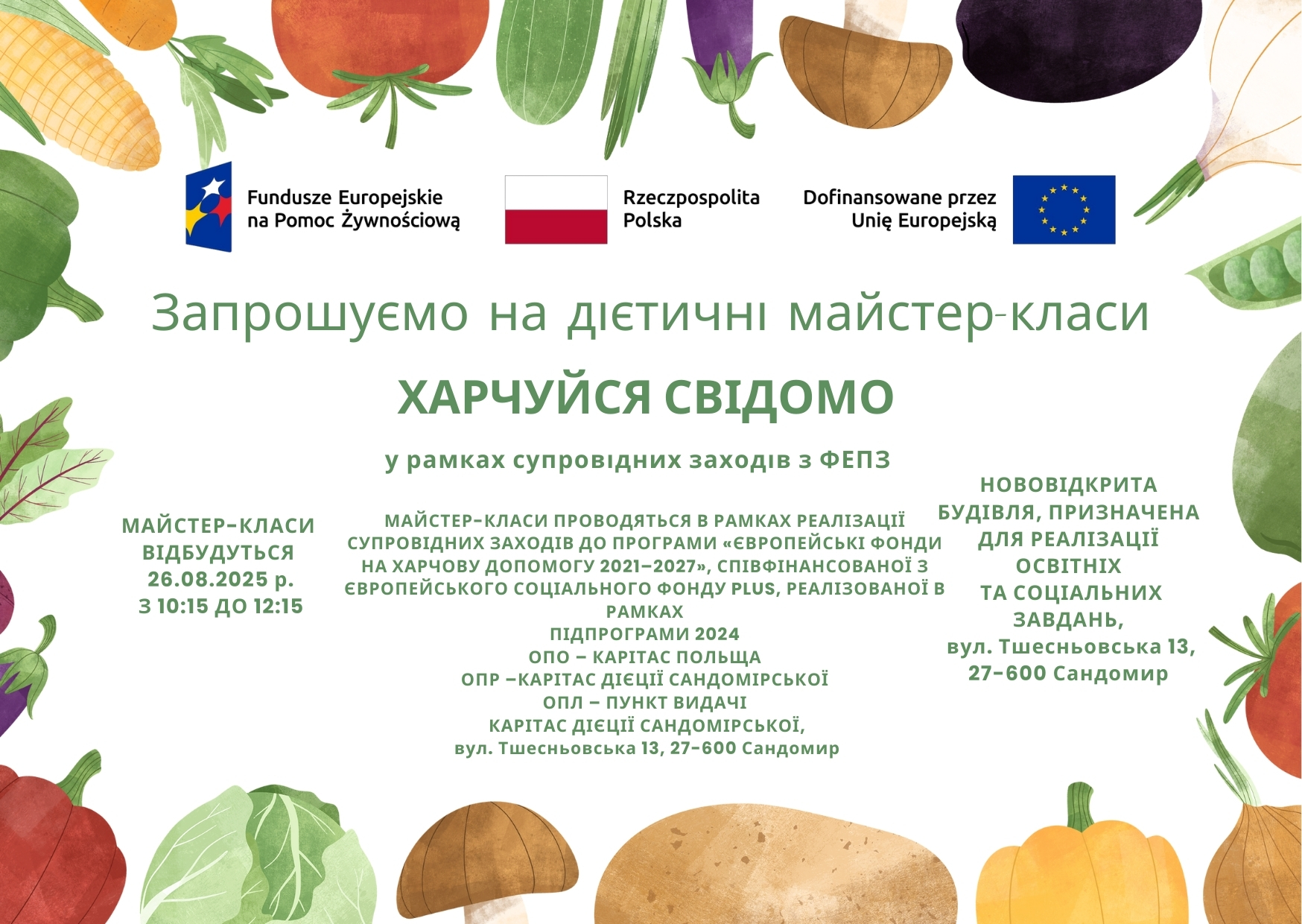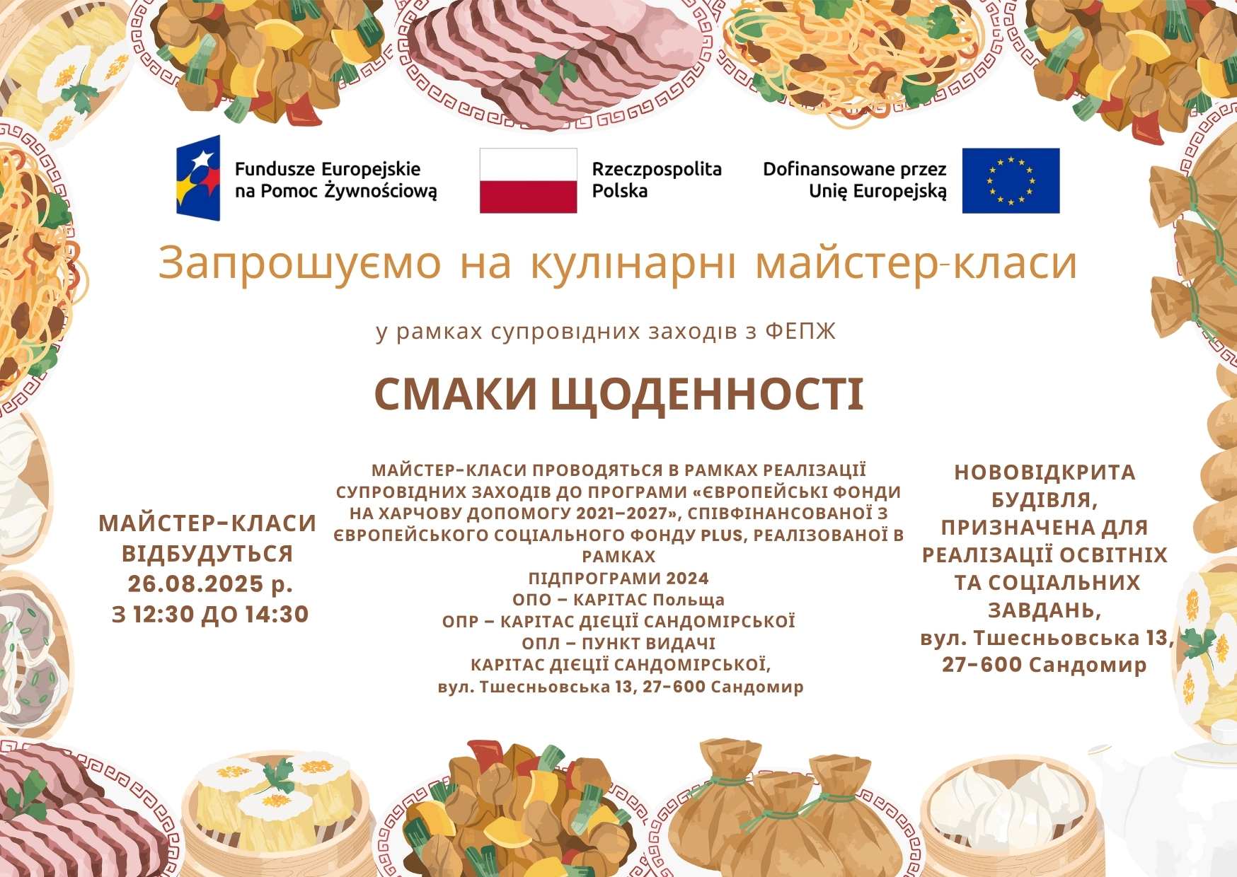 У вівторок, 26 серпня 2025 р., у залі з кухонним куточком двоповерхової будівлі Карітас Сандомирської дієцезії, що знаходиться за адресою: вул. Тшесньовська 13A, 27-600 Сандомир, відбудуться кулінарні, дієтологічні та рукодільні майстер-класи, організовані в рамках програми "Європейські фонди на продовольчу допомогу".