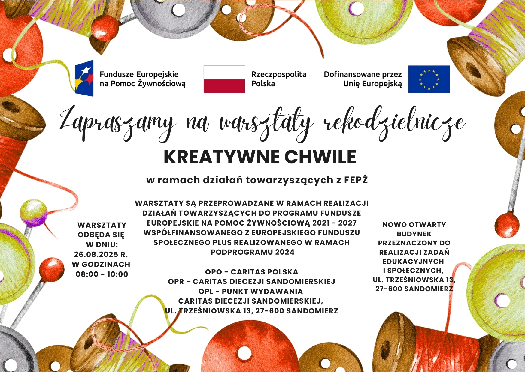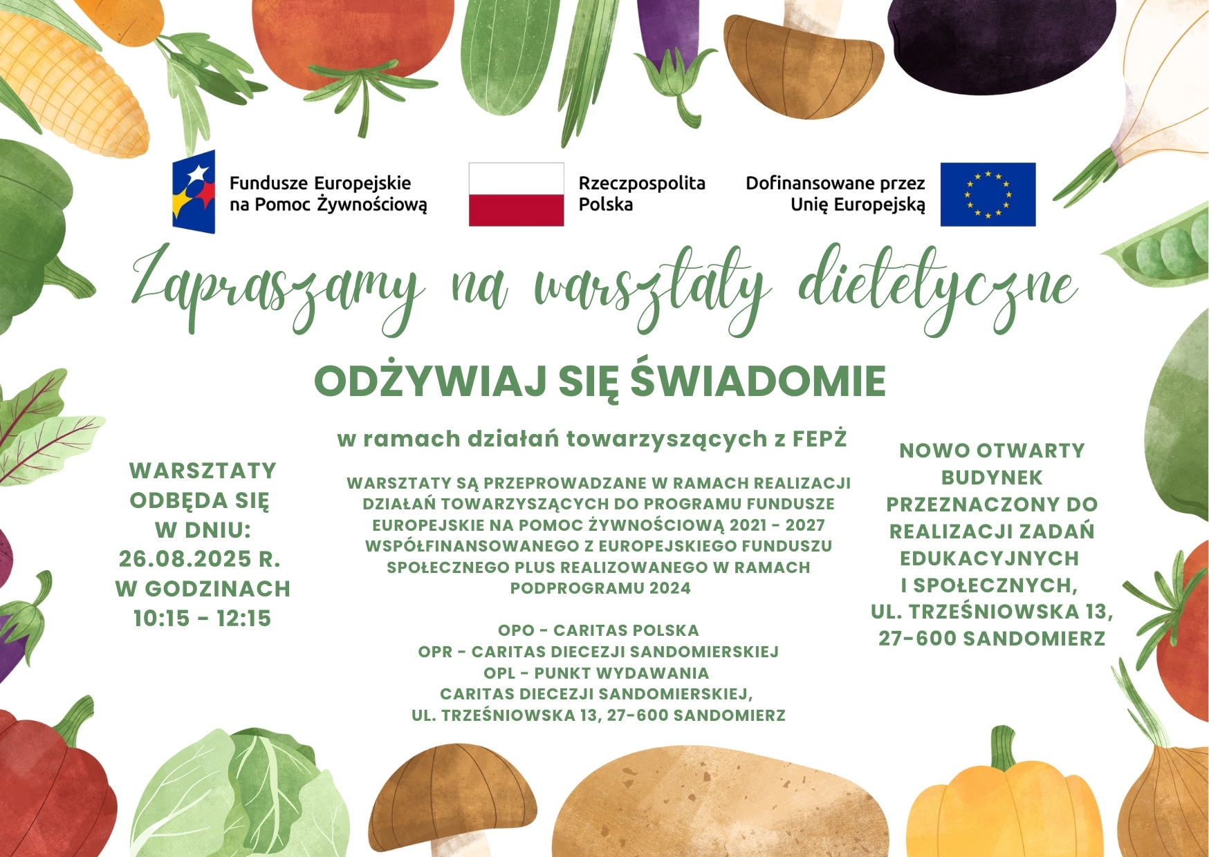 We wtorek, 26 sierpnia 2025 r., w sali z aneksem kuchennym dwukondygnacyjnego budynku Caritas Diecezji Sandomierskiej, mieszczącego się przy ul. Trześniowskiej 13, 27-600 Sandomierz, odbędą się warsztaty kulinarne, dietetyczne oraz rękodzielnicze organizowane w ramach programu „Fundusze Europejskie na Pomoc Żywnościową”.