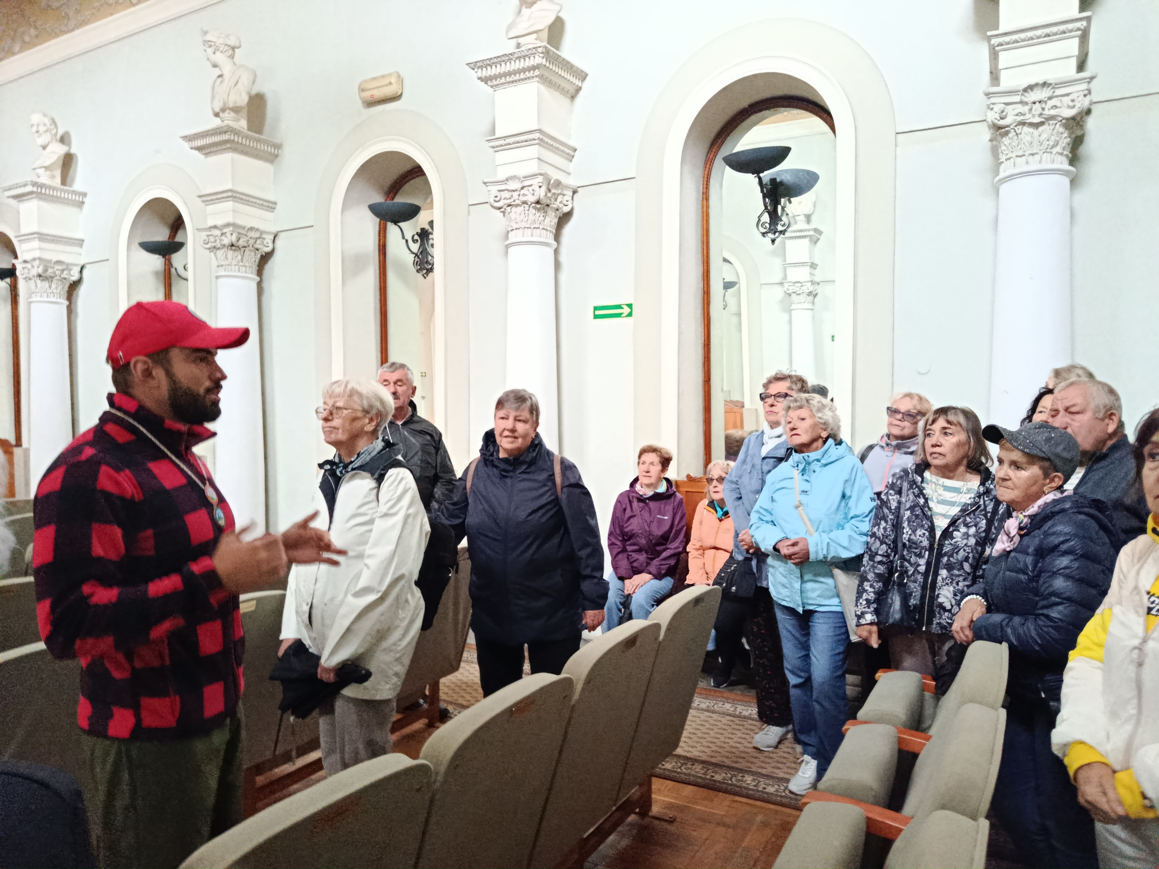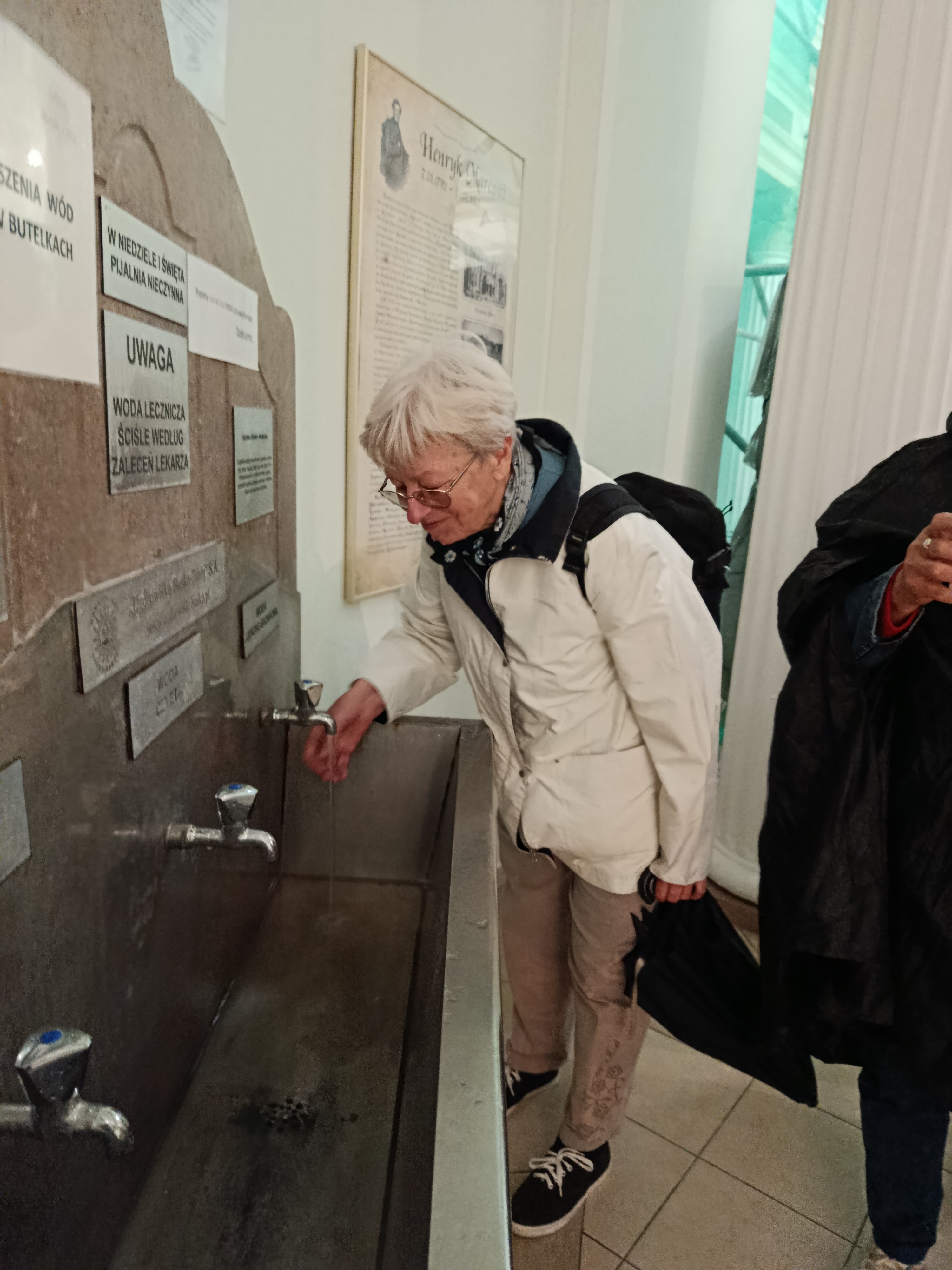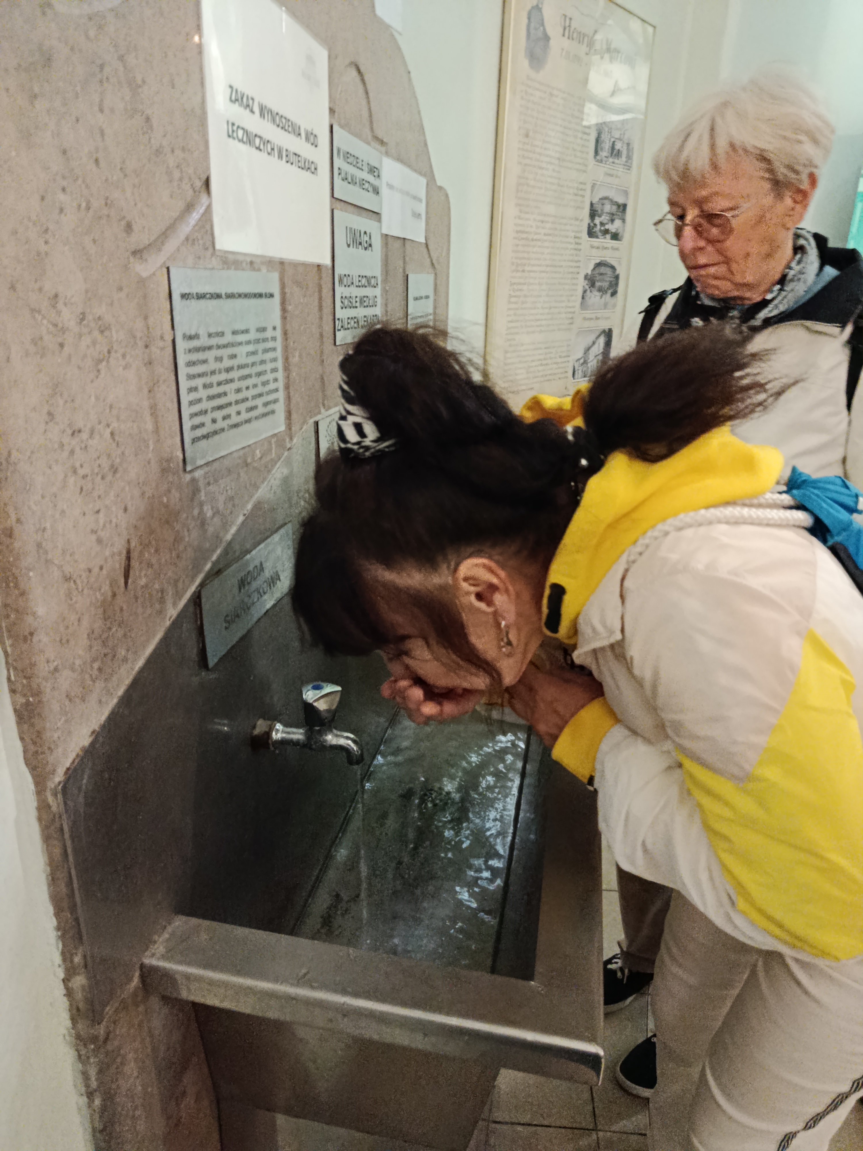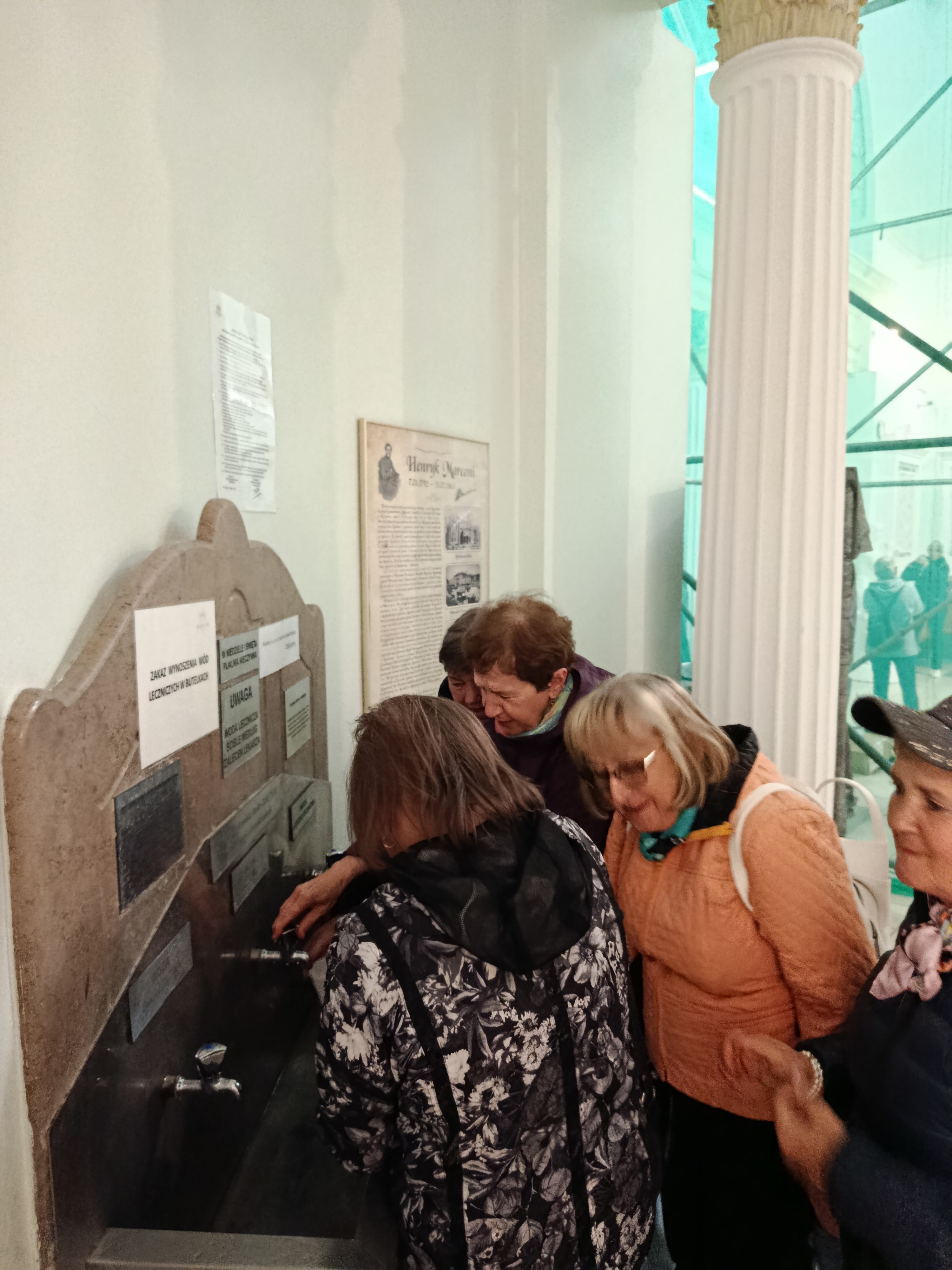 Zwiedzanie rozpoczęło się od spaceru po malowniczym Parku Zdrojowym, zachwycającym zielenią, kolorowymi dywanami kwiatów oraz charakterystyczną muszlą koncertową. Następnie grupa odwiedziła Sanatorium Marconi – jeden z najbardziej rozpoznawalnych symboli uzdrowiska. Seniorzy mogli podziwiać imponującą architekturę obiektu oraz spróbować leczniczych wód mineralnych, m.in. siarczkowych, chlorkowo-sodowych i jodkowych.