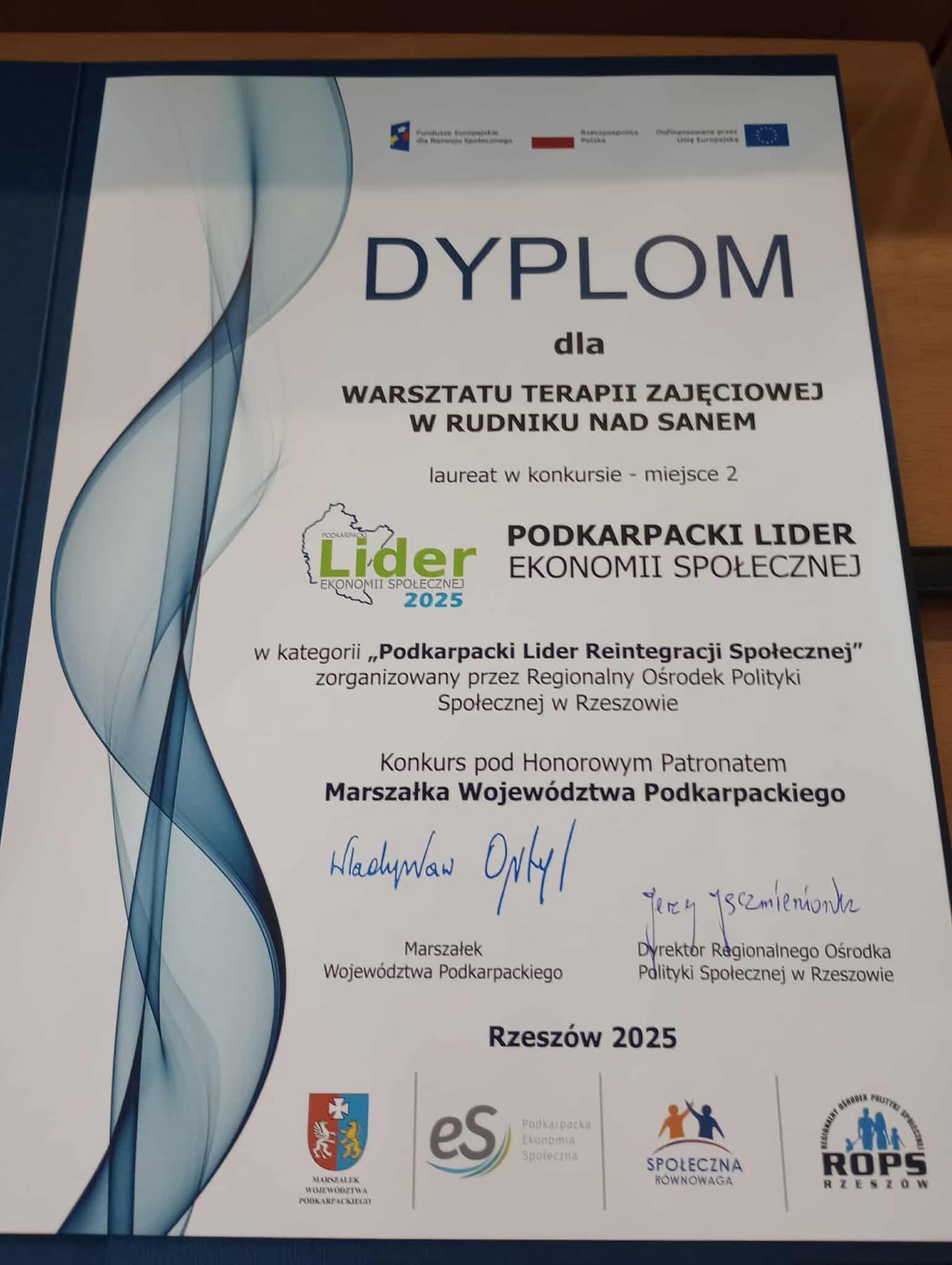 Z dumą informujemy, że nasz Warsztat Terapii Zajęciowej w Rudniku nad Sanem został uhonorowany II nagrodą w konkursie "Podkarpacki Lider Reintegracji Społecznej".