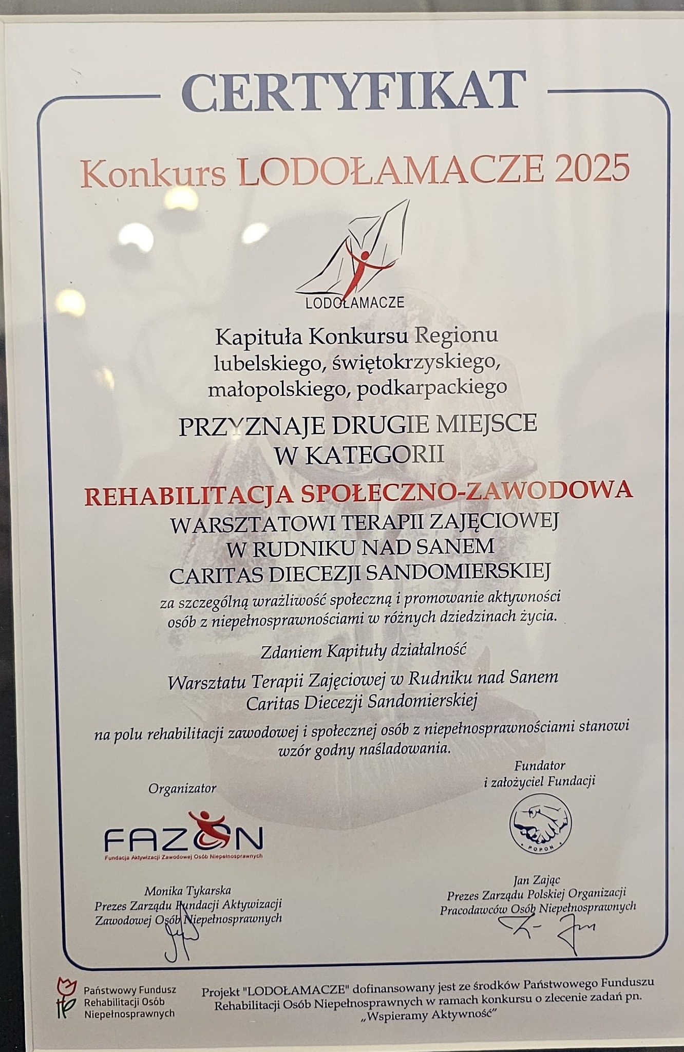 Warsztat Terapii Zajęciowej w Rudniku nad Sanem, prowadzony przez Caritas Diecezji Sandomierskiej, po raz kolejny znalazł się w gronie laureatów konkursu Lodołamacze 2025. Podczas Regionalnej Gali, która odbyła się w Urzędzie Wojewódzkim w Rzeszowie, placówka otrzymała II miejsce w kategorii „Rehabilitacja społeczno-zawodowa”.
