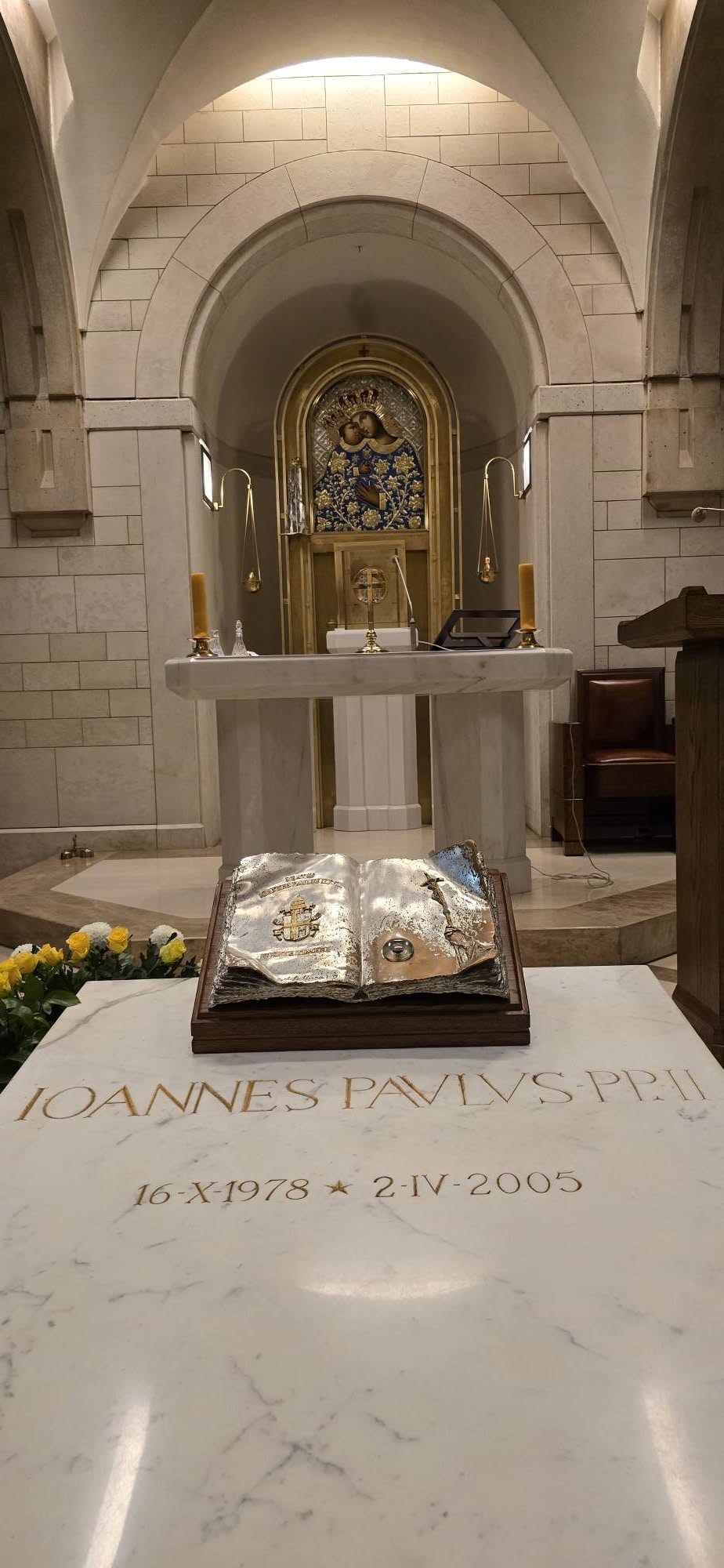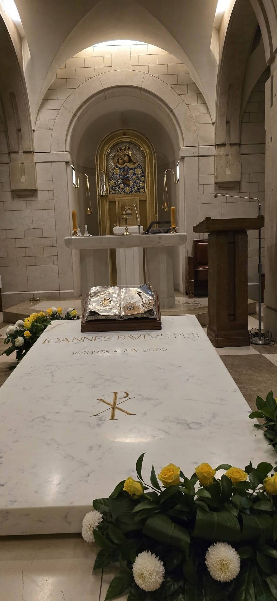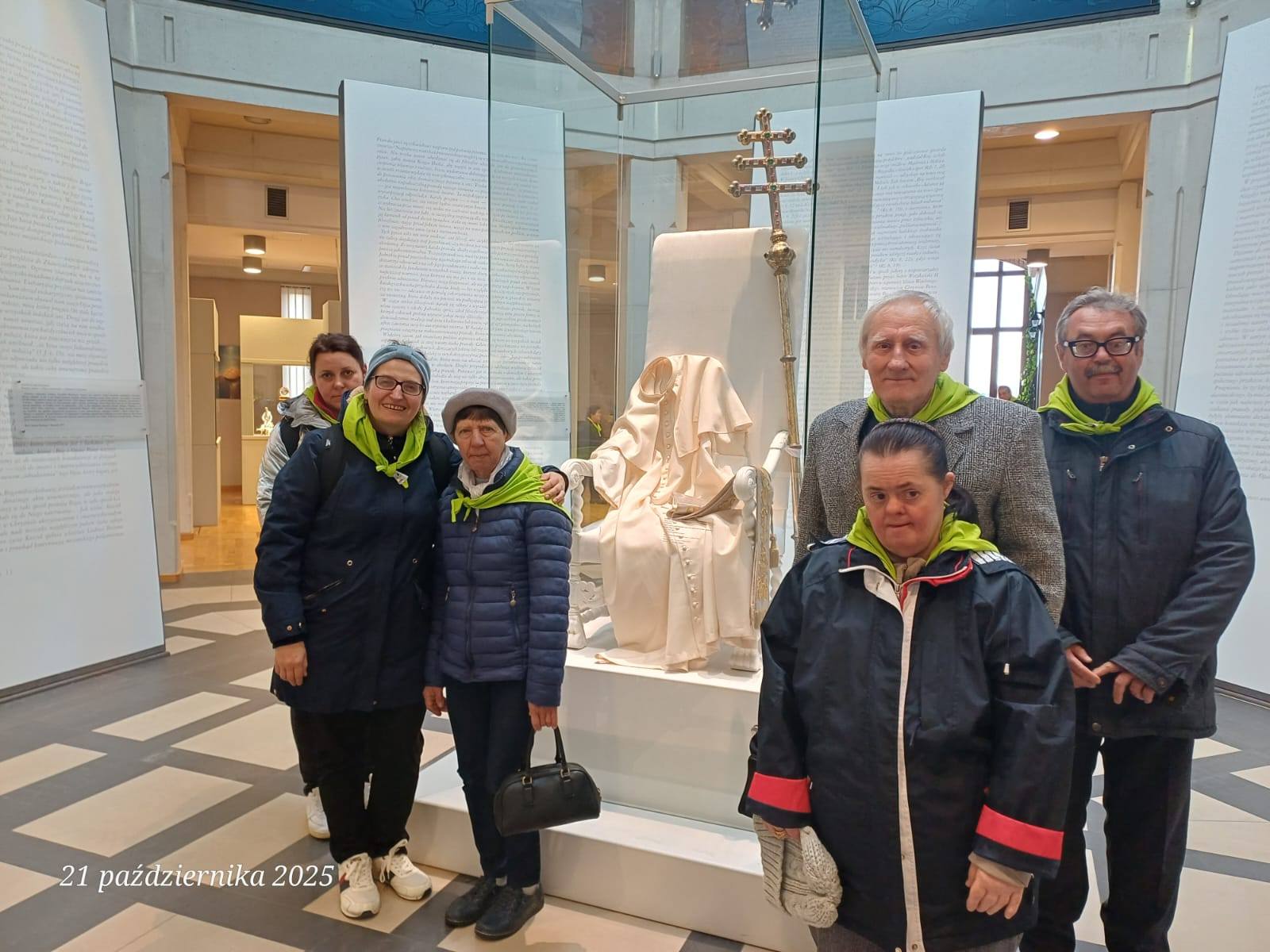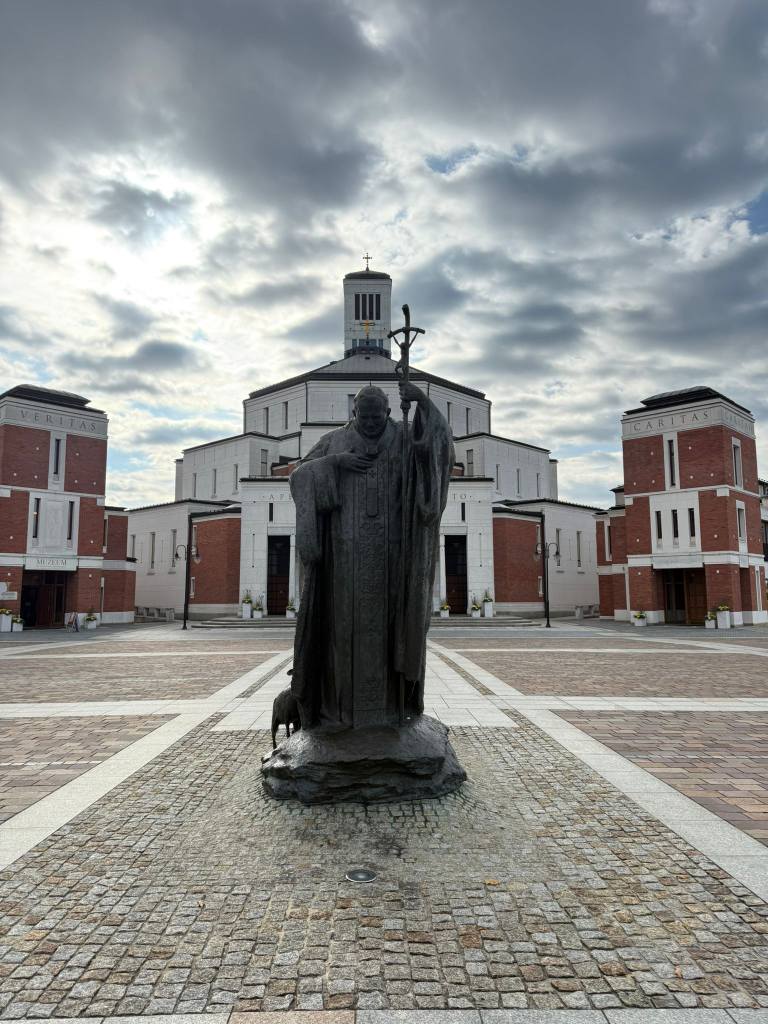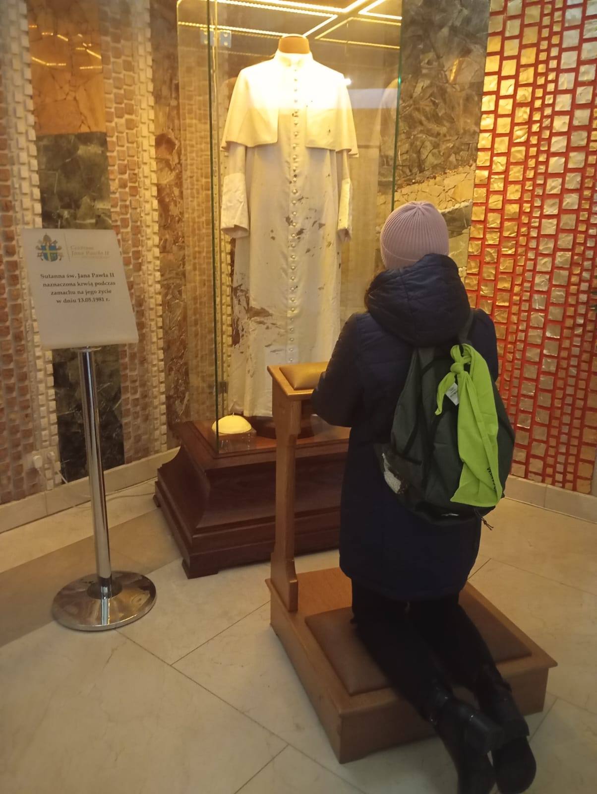 Kolejnym etapem duchowej wędrówki było Sanktuarium św. Jana Pawła II. Tam zwiedziliśmy Muzeum św. Jana Pawła II, które w niezwykle przejmujący sposób ukazuje życie i pontyfikat Papieża Polaka. Ekspozycja przybliżyła pielgrzymom jego nauczanie o miłosierdziu, pokoju i godności człowieka. Szczególne wrażenie wywarły autentyczne pamiątki z życia Świętego, w tym fragment sutanny z dnia zamachu oraz liczne fotografie dokumentujące jego posługę na całym świecie.